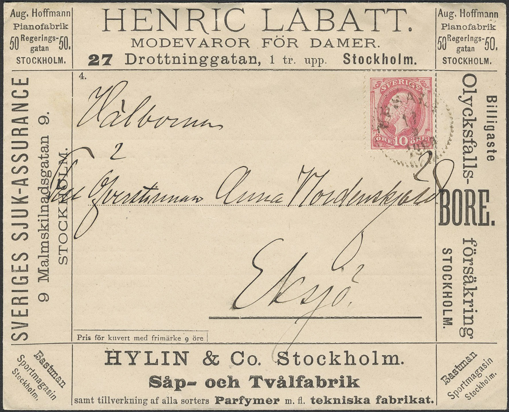 Sweden. Facit 45 on cover, 10 öre on a nice advertisment envelope, sold at a discount for 9 öre. Sent from UPSALA 1x.2.1888 to Eksjö.