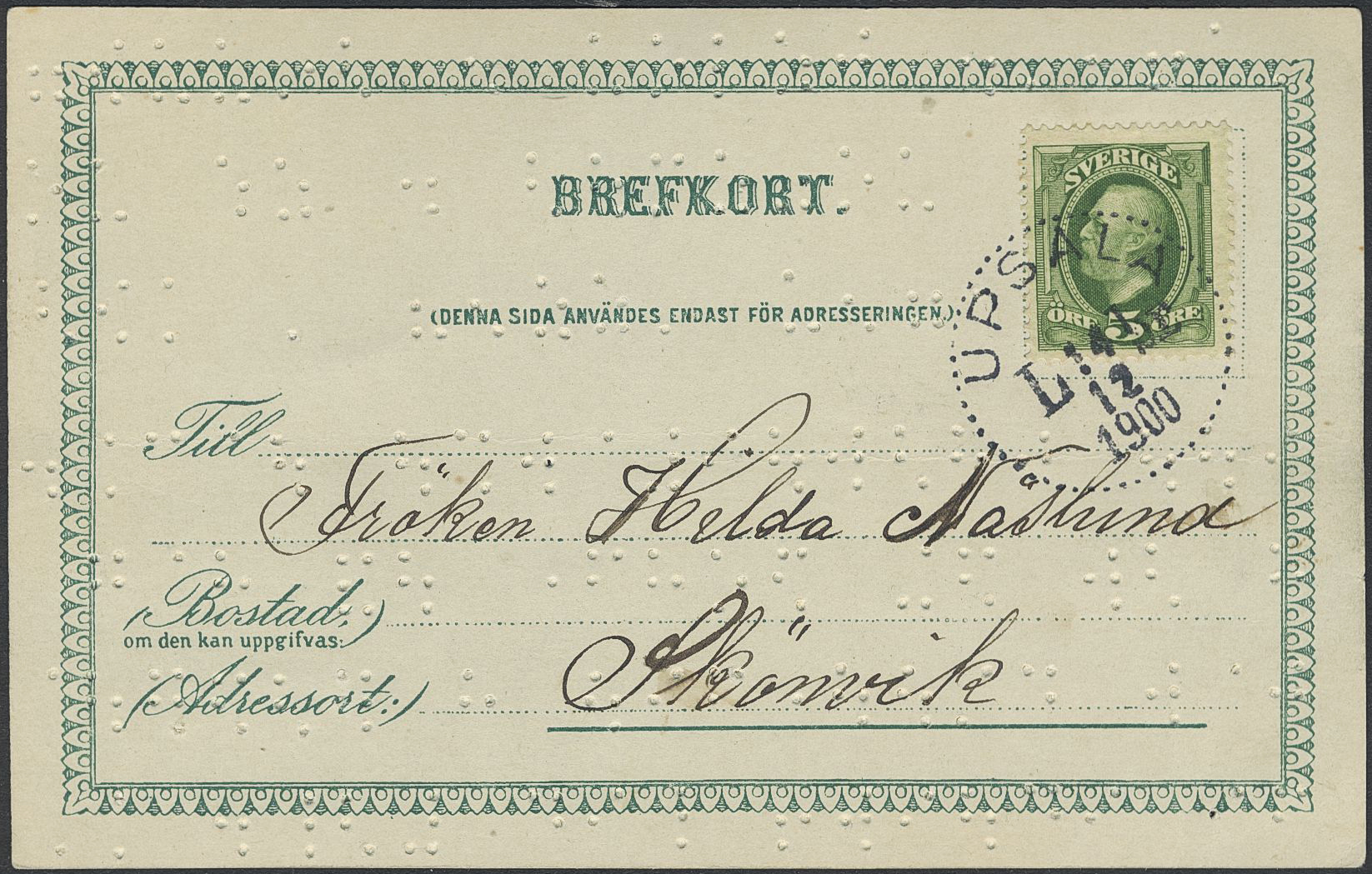 Sweden. Facit 52 on cover, 5 öre on postcard with BRAILLE, sent from UPSALA Lbr 14.12.1900 to Skönvik. Scarce.