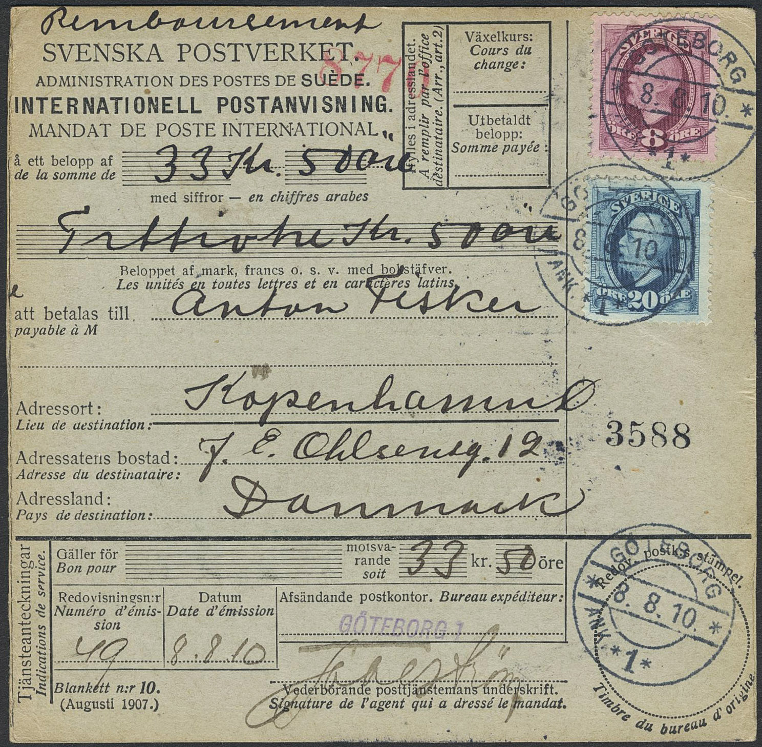 Sweden. Facit 53, 56 on cover, 8+20 öre on cash on delivery money order sent from GÖTEBORG 8.8.10 to Denmark. Arrival pmk KJØBENHAVN 8.8.10.