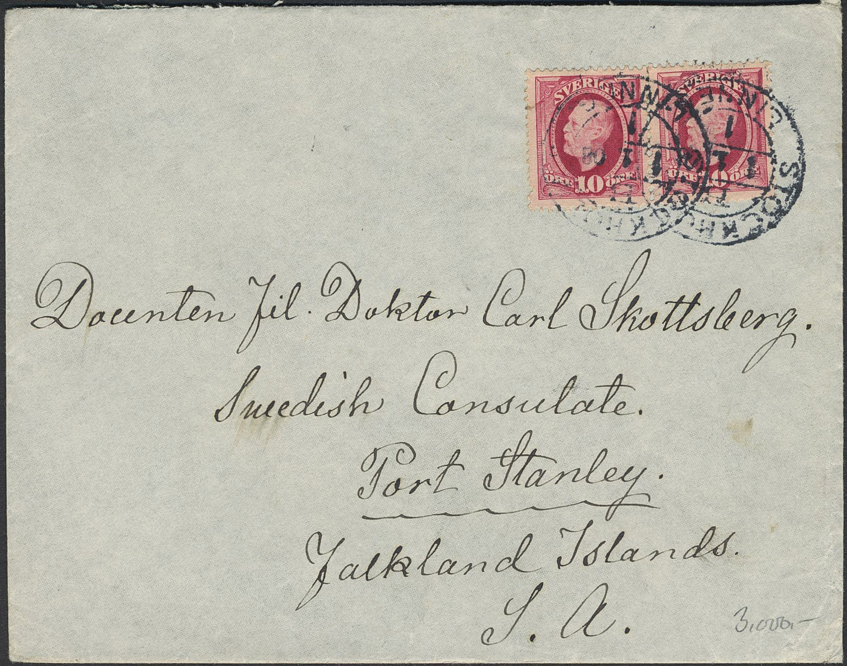 Sweden. Facit 54 on cover, 2×10 öre on cover sent from STOCKHOLM 1.1.08 to the FALKLAND ISLANDS. Sought-after Expedition mail item.