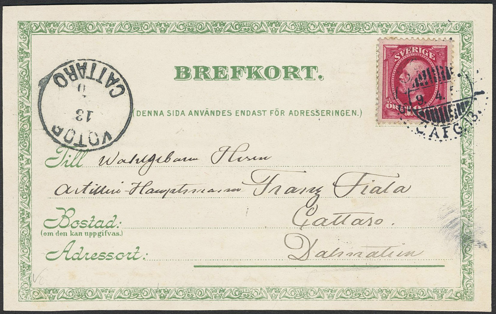 Sweden. Facit 54 on cover, 10 öre on postcard sent from STOCKHOLM 1 9.4.00 to Montenegro, with arrivial pmk KOTOR CATTARO 13.4.00. Very scarce destination.
