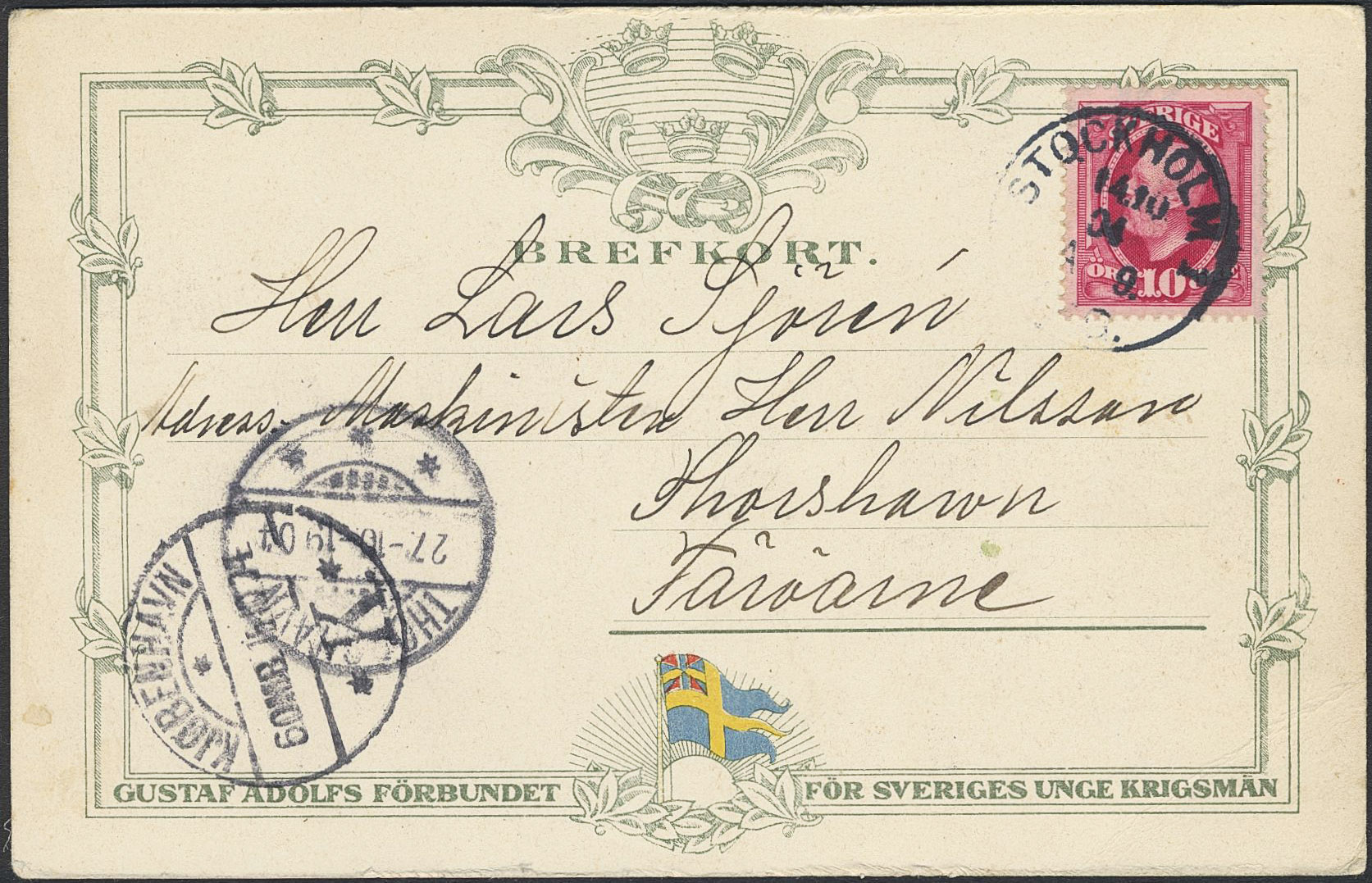 Sweden. Facit 54 on cover, 10 öre on beautiful postcard sent from STOCKHOLM 1 14.10.04 to the Faroe Islands, with arrival pmk THØRSHAVN 27.10.04. Very scarce destination.