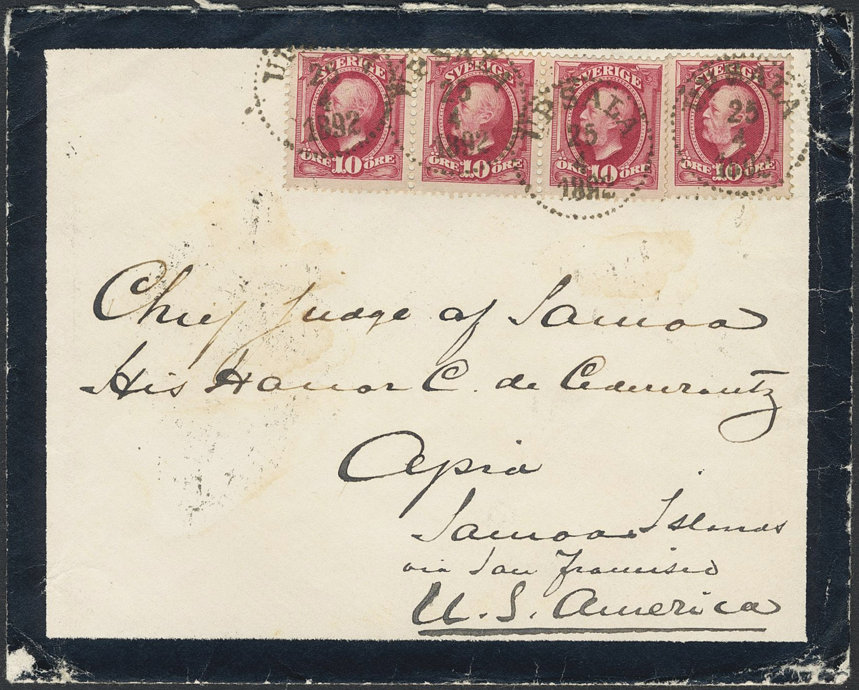 Sweden. Facit 54 on cover, 4×10 öre on cover sent from UPSALA 25.4.1892 via SAN FRANCISCO to Samoa. Nice item.