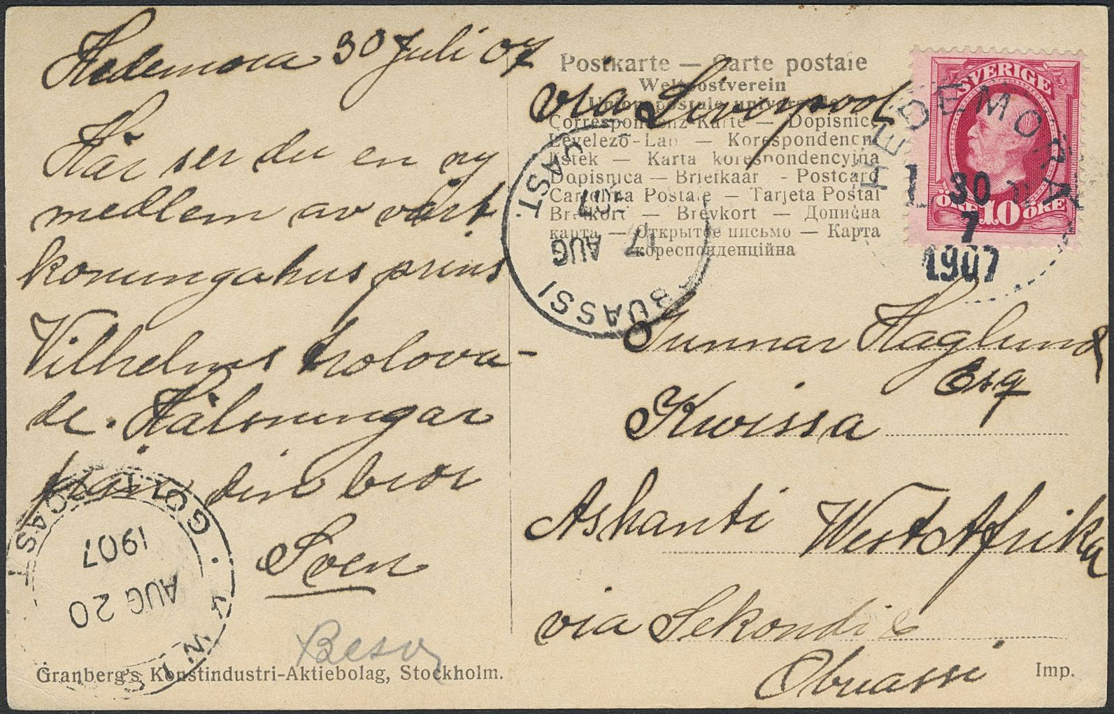 Sweden. Facit 54 on cover, 10 öre on postcard sent from HEDEMORA 30.7.1907 to Gold Coast, with arrival pmk KWISSA 20.AUG.1907.