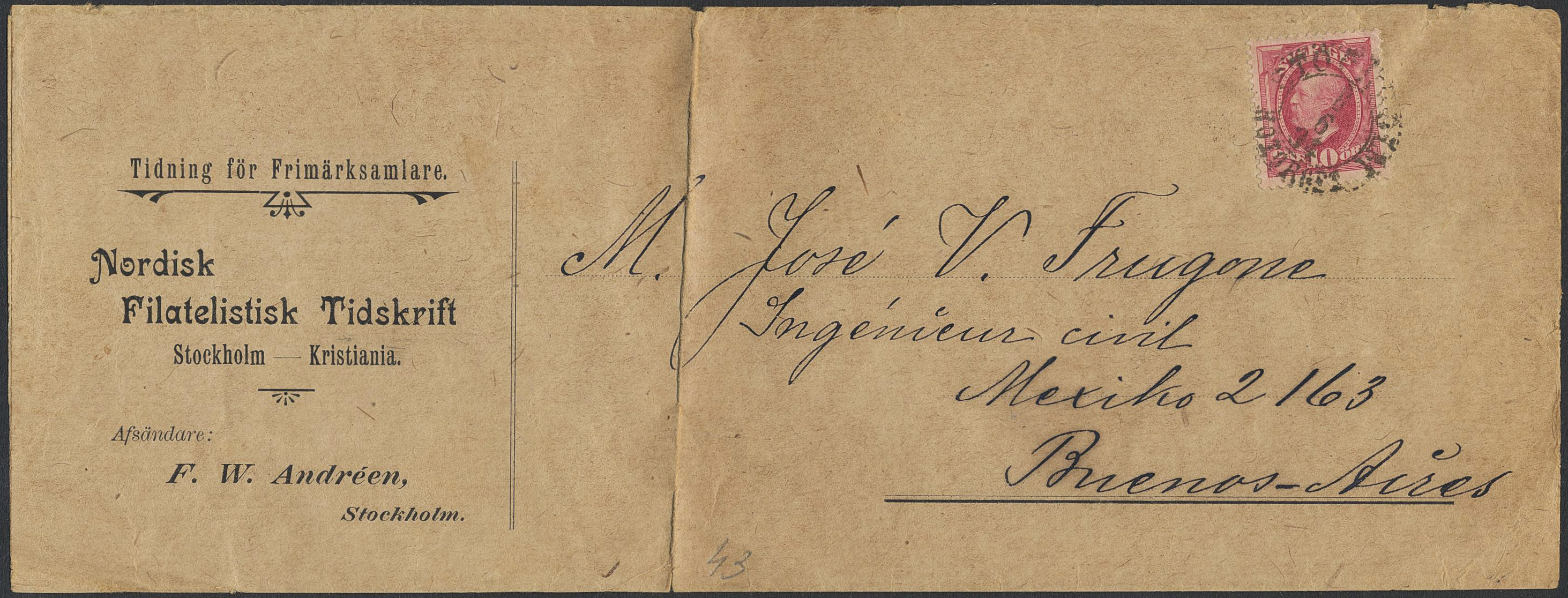 Sweden. Facit 54 on cover, 1891 Oscar II 10 öre red. 10 öre on newspaper banner sent from STOCKHOLM 8.6.04 to Argentina.