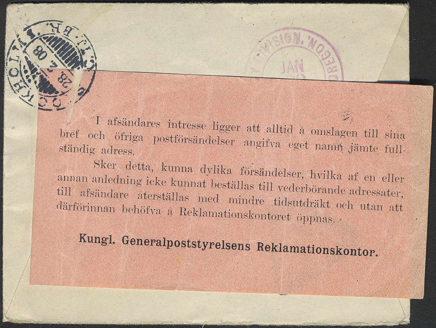 Sweden. Facit 54 on cover, 2×10 öre on cover sent from SALTSJÖ-DUFNÄS 7.12.1907 to USA. Undeliverable with cancel UNCLAIMED and label from 'Kungl. Generalpoststyrelsens Reklamationskontor'.
