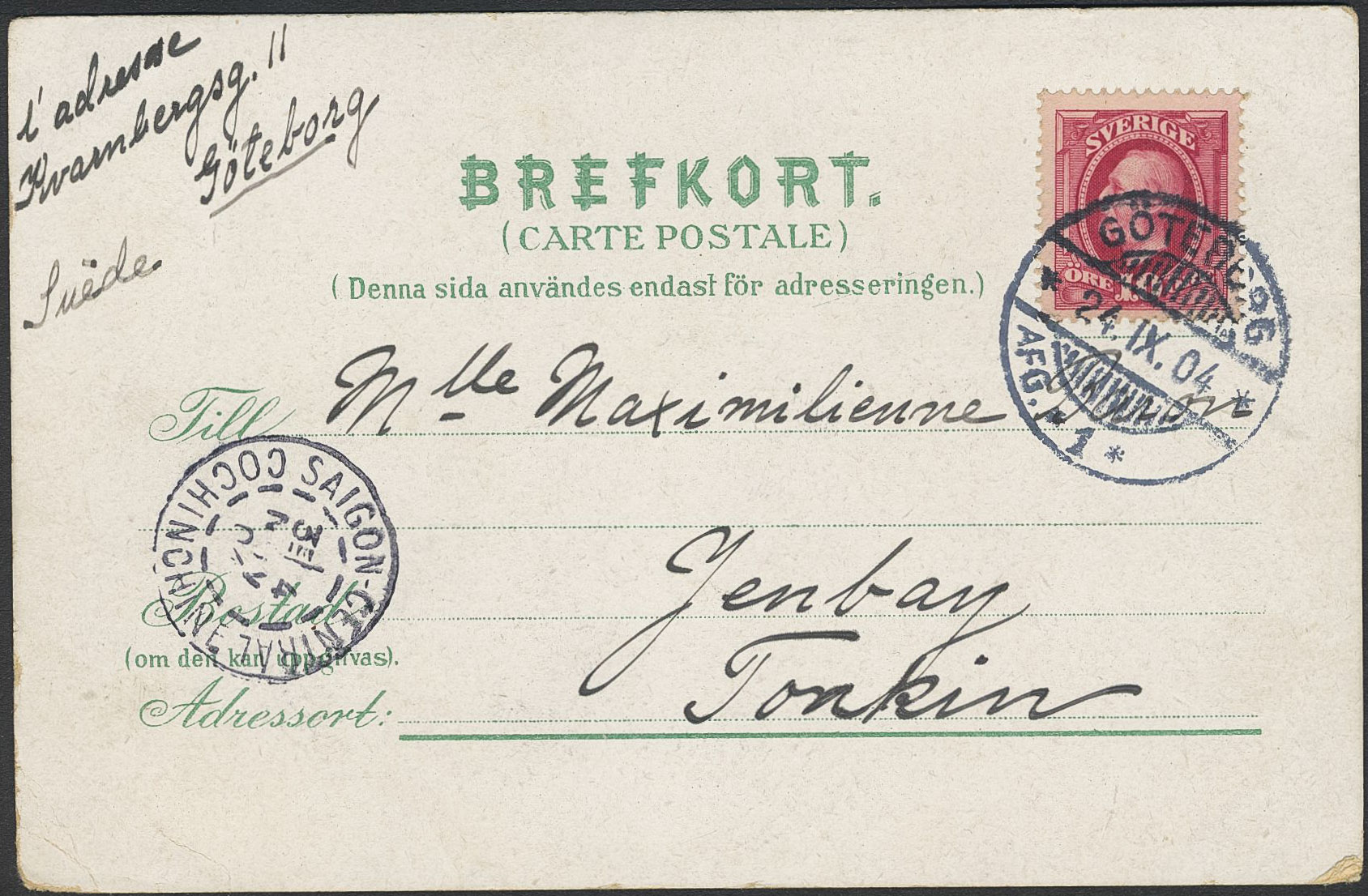 Sweden. Facit 54 on cover, 10 öre on postcard sent from GÖTEBORG 24.IX.04 to Tonkin, Indochinese Union with pmk SAIGON-CENTRAL COCHINCHINE 4.MAY.04.