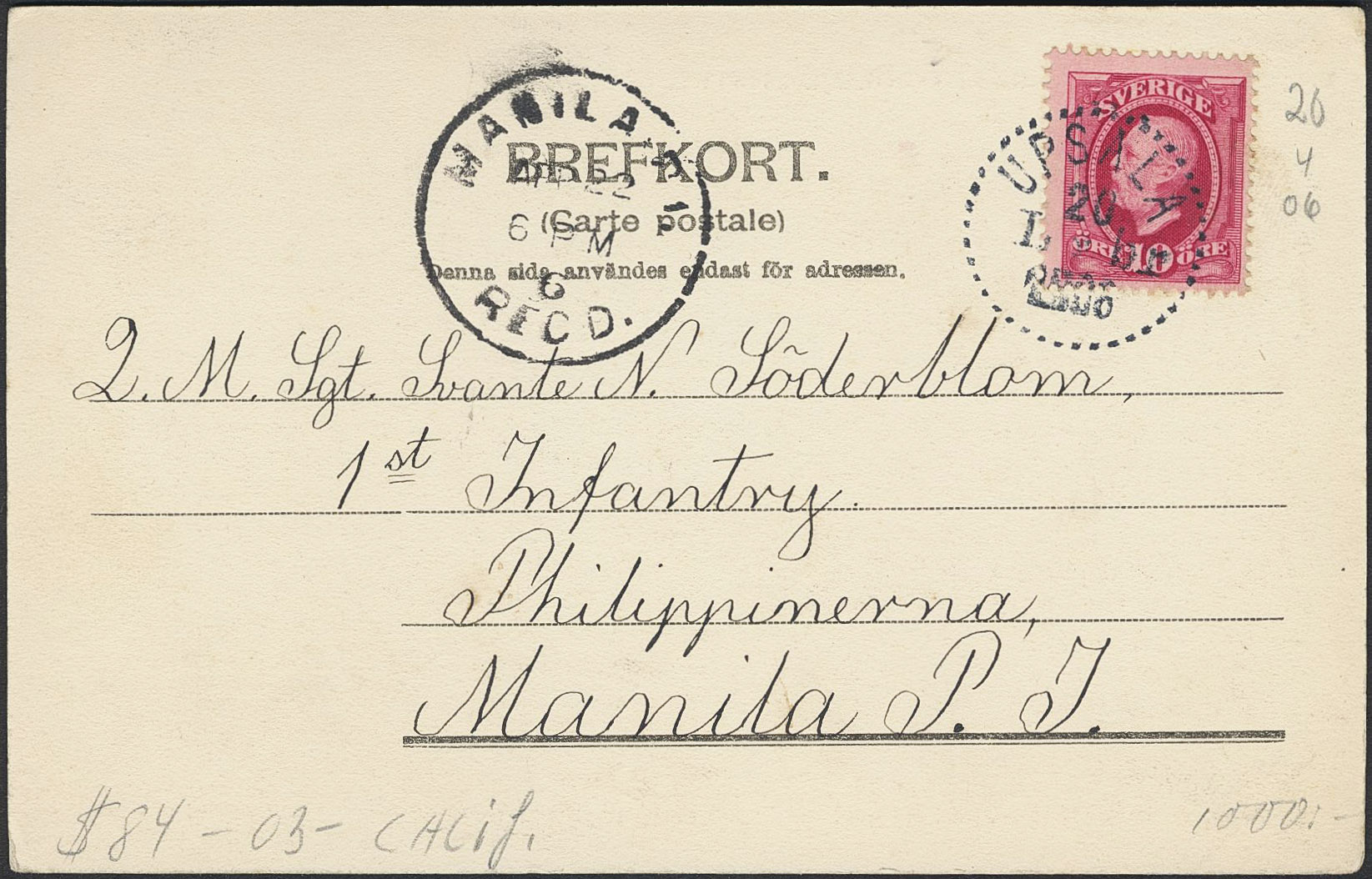 Sweden. Facit 54 on cover, 10 öre on postcard sent from UPSALA 20.4.1906 to the Philippines with arrival pmk MANILA RECD 22.APP.6.