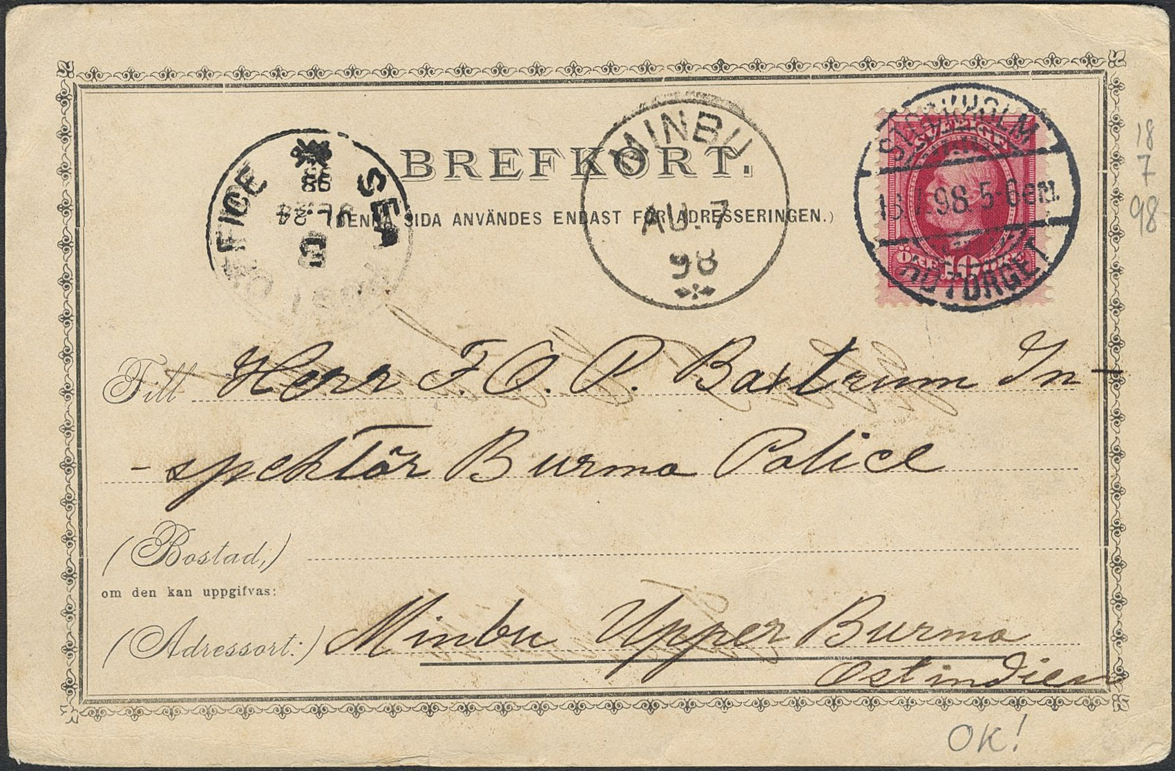 Sweden. Facit 54 on cover, 10 öre on postcard sent from STOCKHOLM 13.7.98 to Britsh Burma with arrival pmk MINBU 7.AU.98. Scarce destination.