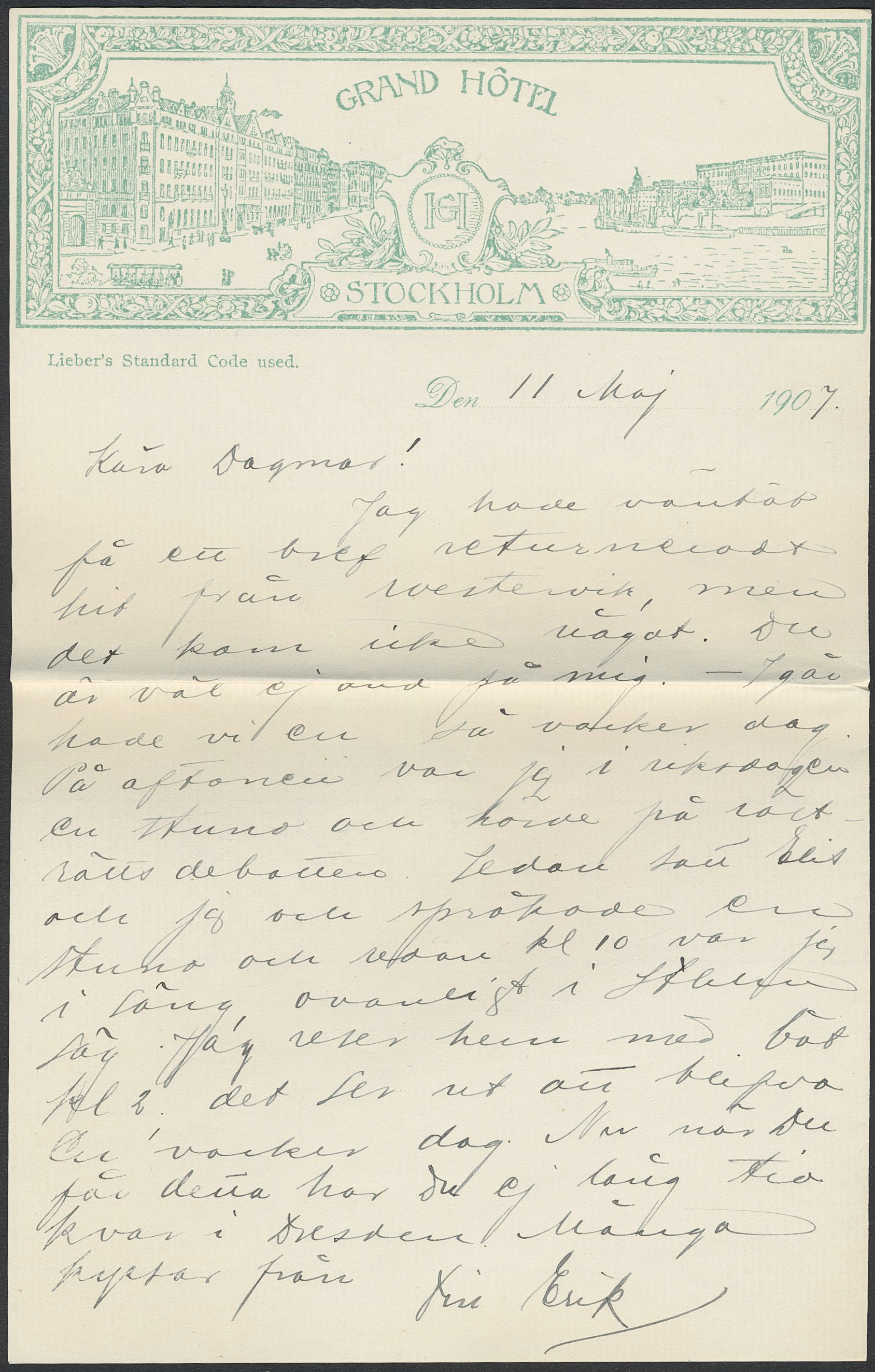Sweden. Facit 54v15 on cover, 1891 Oscar II 10 öre red, pair from booklet with missing perf hole. EXCELLENT cover with vignette GRAND HOTEL STOCKHOLM, with content with beautiful vignette as well. Sent from STOCKHOLM LBR 11.5.07 to Germany with arrival pmk DRESDEN 13.5.07. Probably the most beautiful cover known with this variety.
