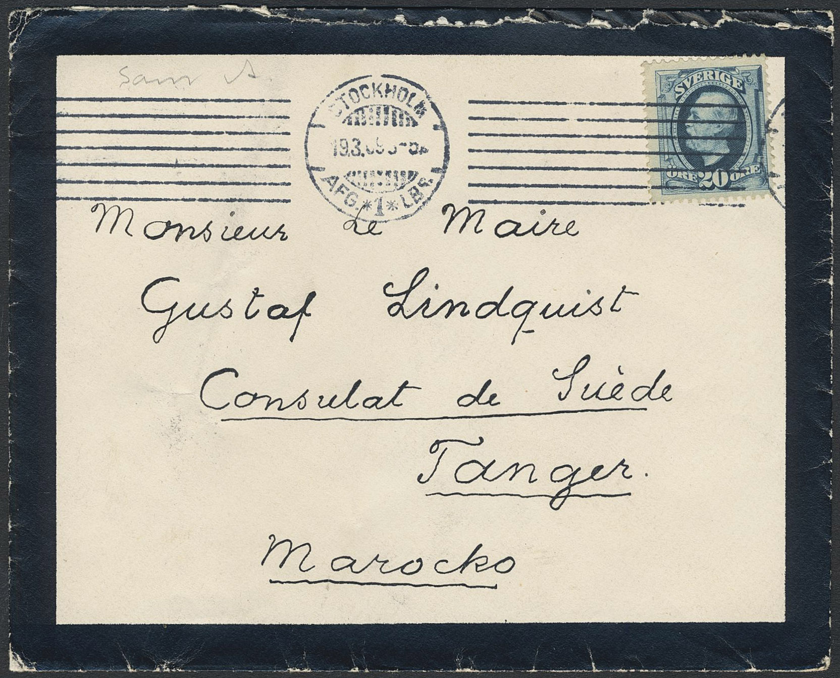 Sweden. Facit 56 on cover, 20 öre on cover sent from STOCKHOLM 19.3.09 to Morocco with arrival pmk TANGER (MAROCCO) DEUTSCHE POST 26.3.09.