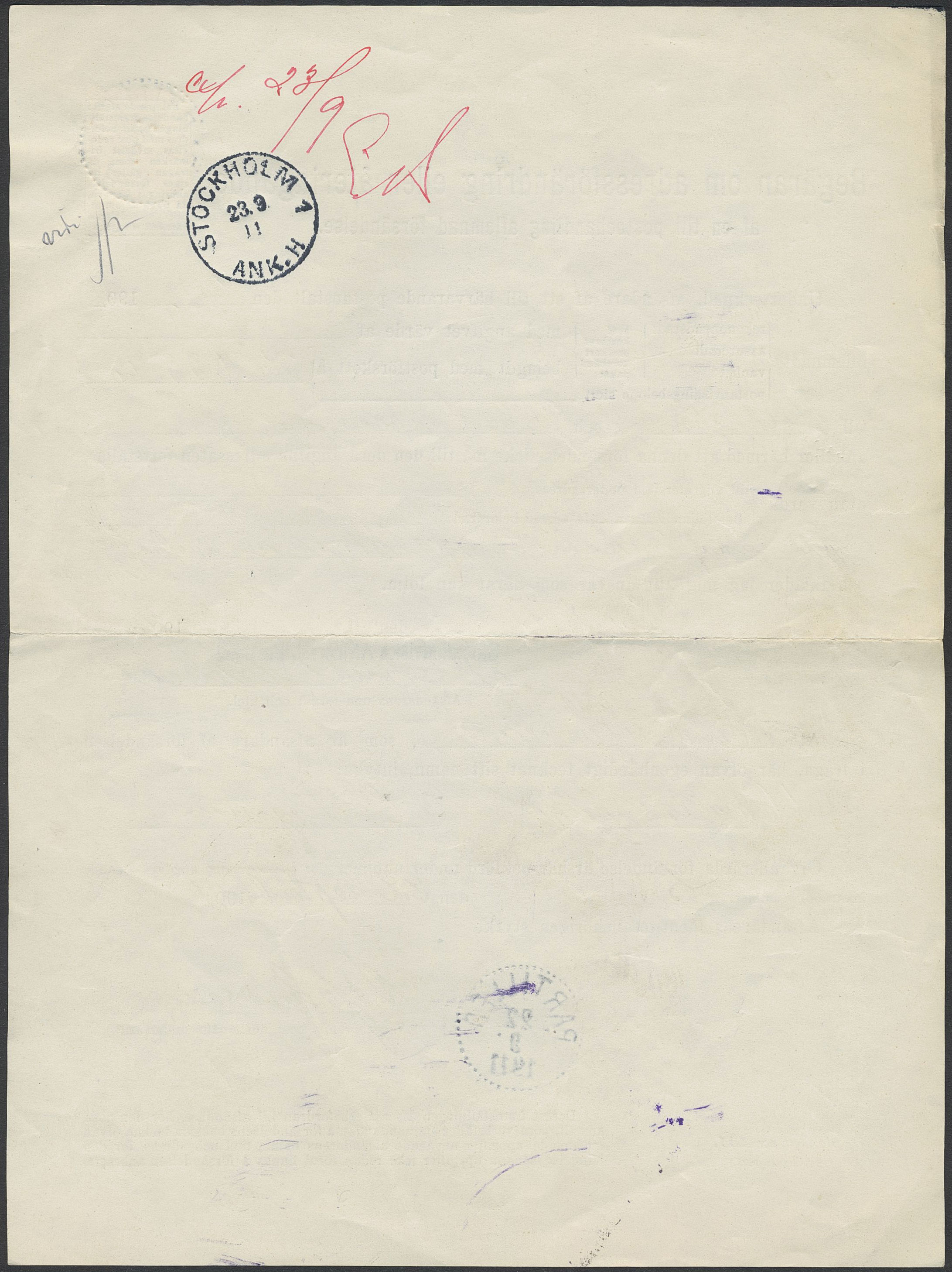 Sweden. Facit 57 on cover, 25 öre on Form No. 131 for withdrawal or change of address with EXCELLENT cancellation PARTILLED 22.9.1911. However, in this case the form is instead used to cancel the cash on delivery amount, a new postal service which was introduced from 1/9 1907 – possibly a unique usage with Oscar II.