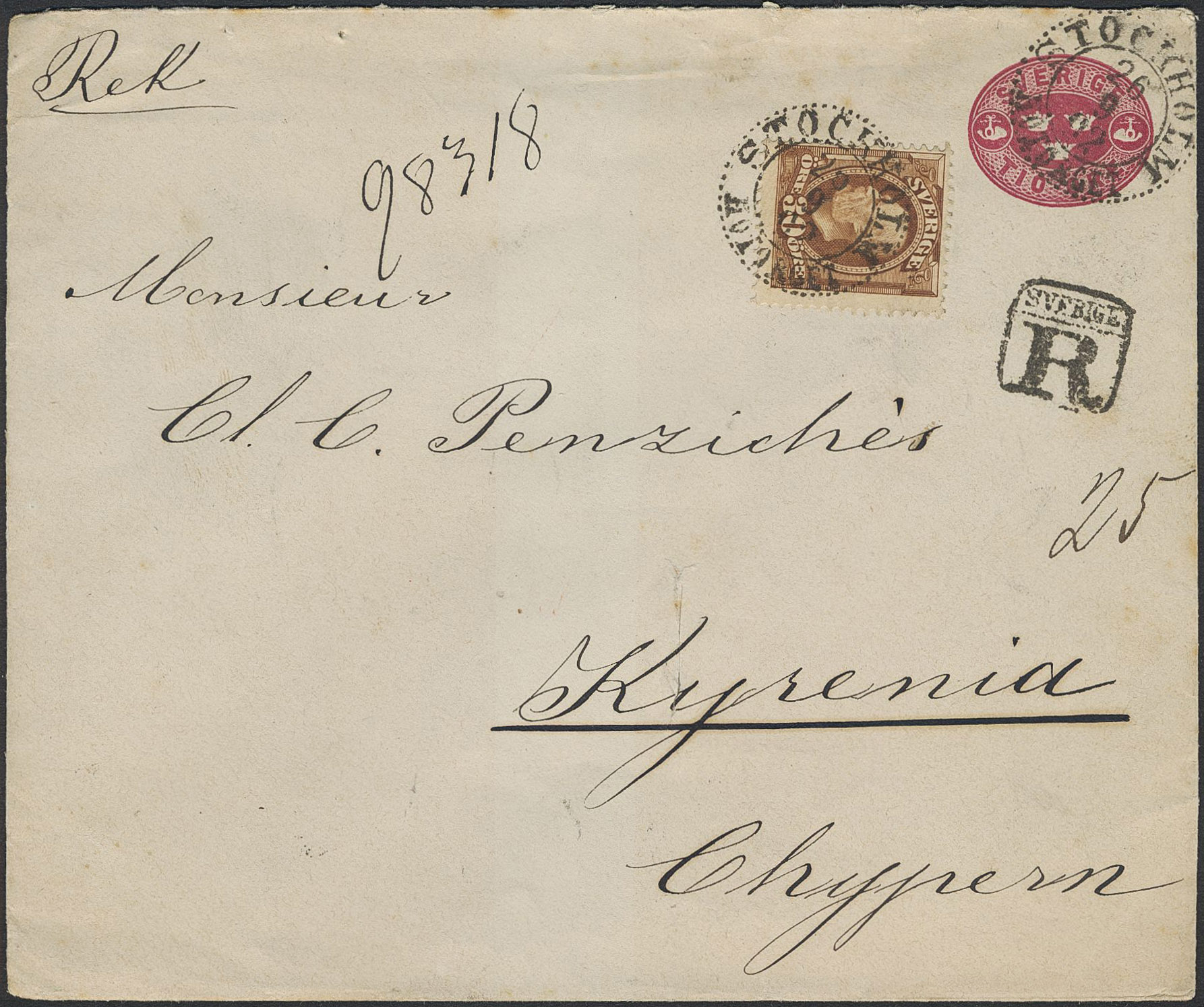 Sweden. Facit 58, Fk3 on cover, 30 öre on stamped envelope 10 öre sent registered from STOCKHOLM HÖTORGET 26.9.92 to Cyprus. Arrival pmks NICOSIA CYPRUS 8.OC.92 and KYREINA CYPRUS 10.OC.92. Cut through the cover.