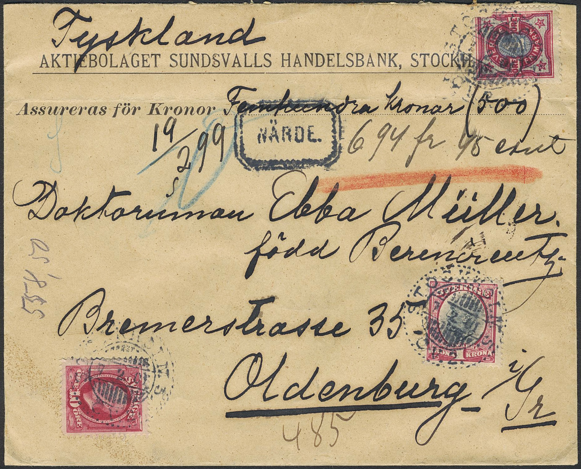 Sweden. Facit 60, 54, 64 on cover, 4+10 öre + 1 kr on insured cover sent from STOCKHOLM 7.2.01 to Germany, with arrival pmk OLDENBURG 9.2.01. One stamp damaged, still beautiful.
