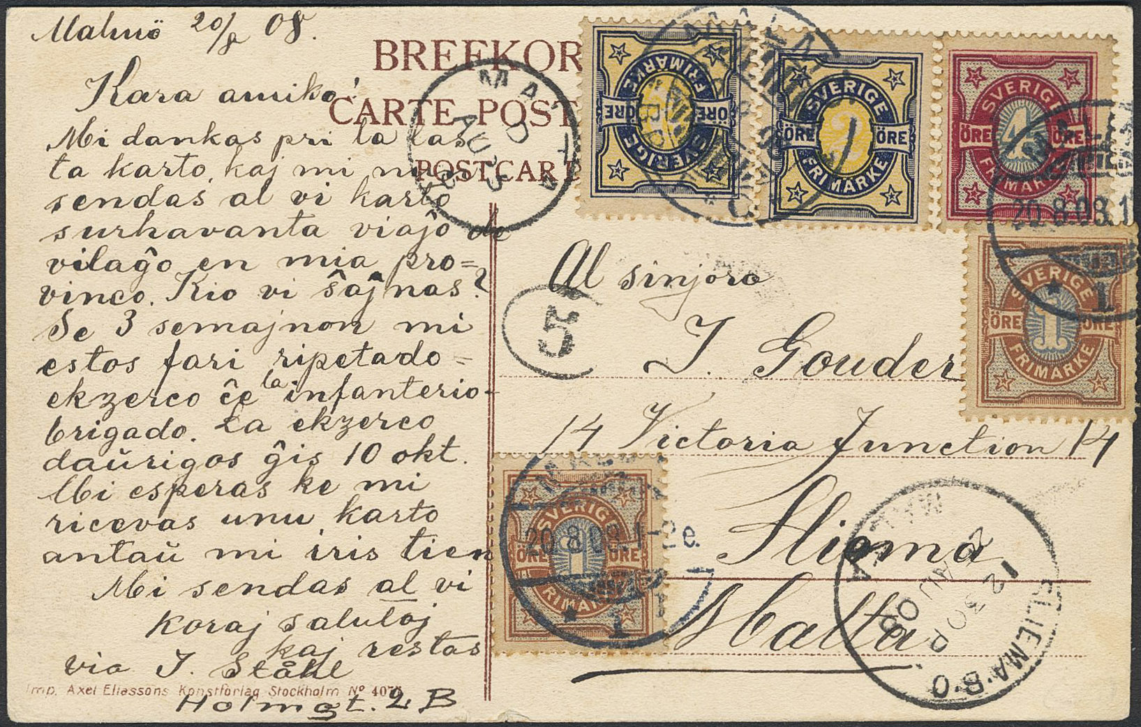 Sweden. Facit 61, 62, 64 on cover, 2×1+2×2+4 öre on postcard sent from MALMÖ 20.8.08 to MALTA 25.AU.08.