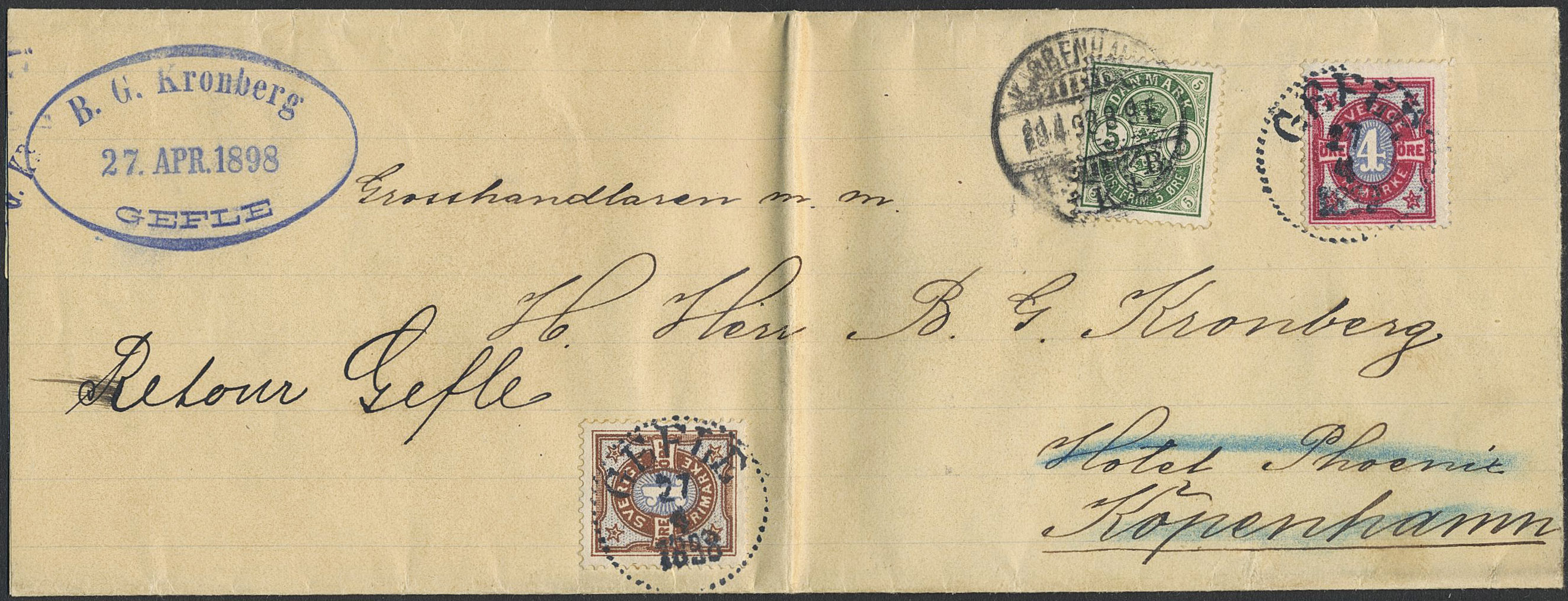 Sweden. Facit 61, 64 on cover, 1+4 öre on pnewspaper banner sent from GEFLE 27.4.1898 to Denmark, then forwarded from KJØBENHAVN 29.4.98 to Gävle.