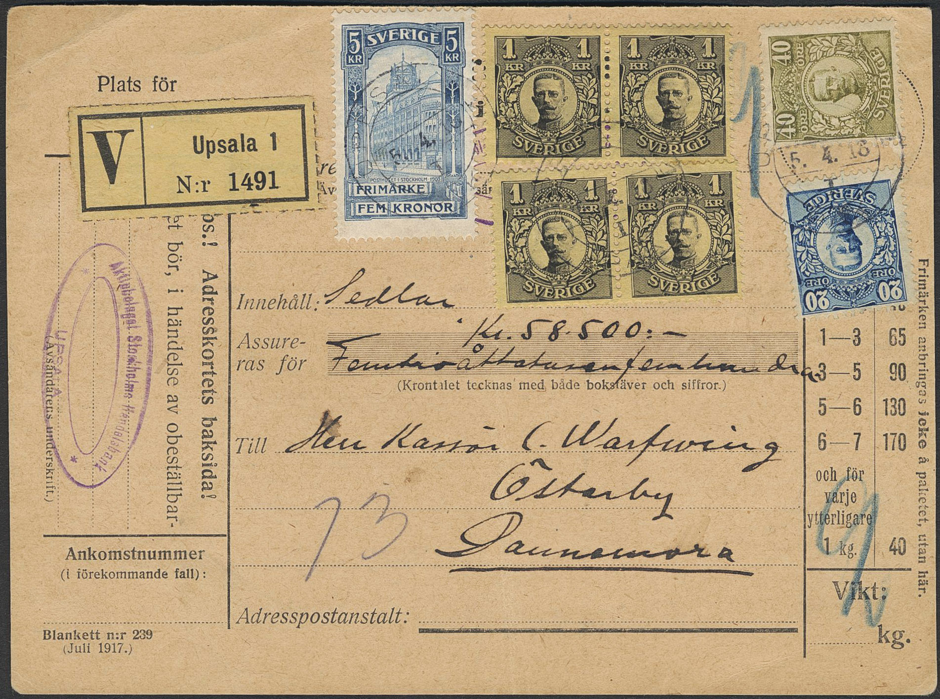 Sweden. Facit 65, 77, 85, 90 on cover, 20+4 öre + 4×+5 kr on address card for insured parcel sent from UPPSALA 5.4.18 to DANNEMORA 6.4.1918.