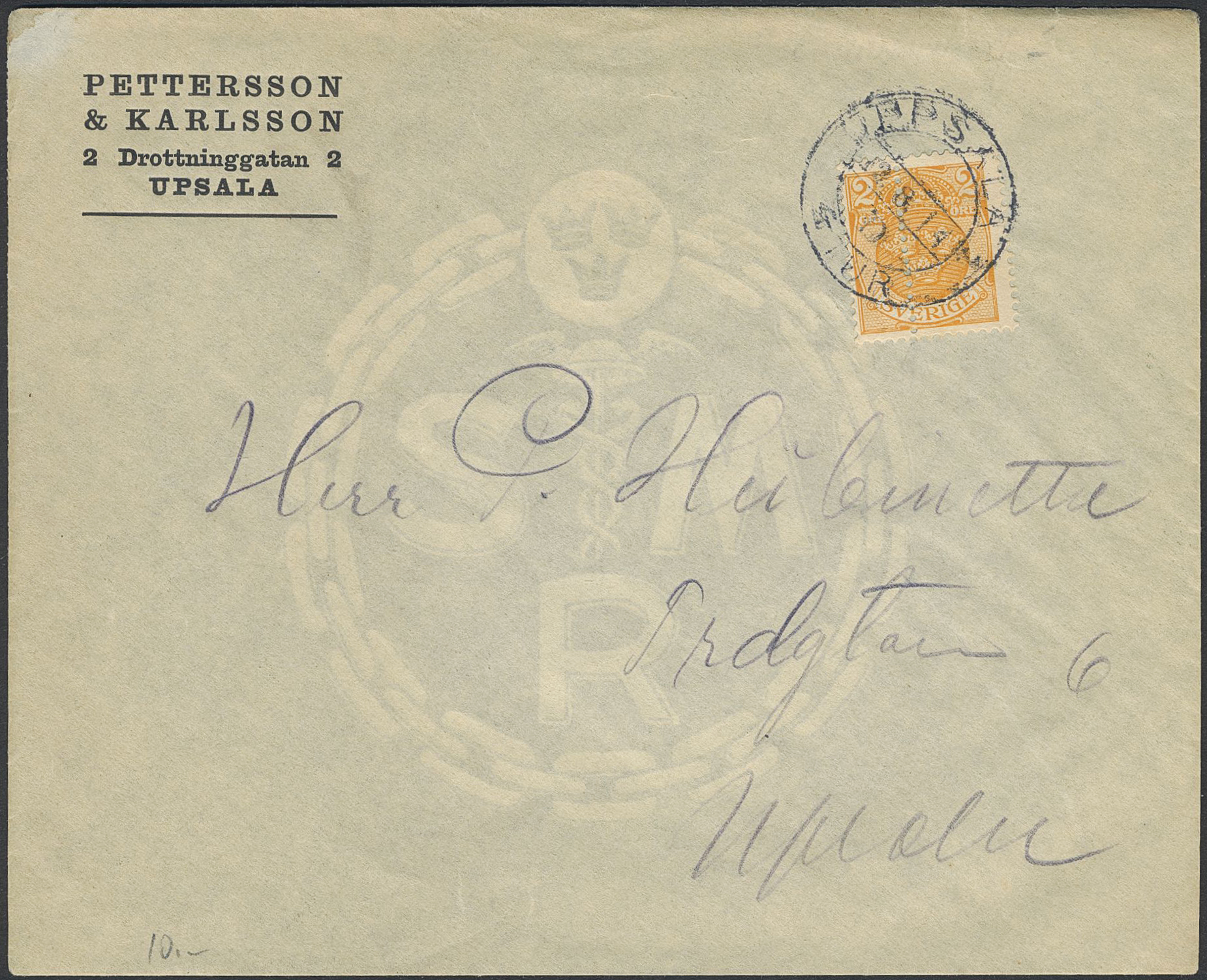Sweden. Facit 72 on cover, 2 öre with extra perforation through the stamp, on locql cover sent cancelled UPPSALA 4.TUR 12.8.14.