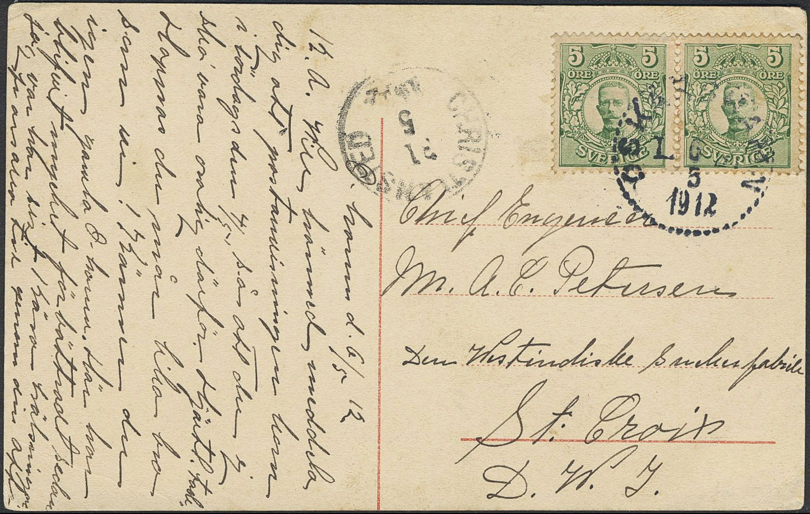 Sweden. Facit 79 on cover, 2×5 öre on cover sent from OSKARSHAMN 6.5.1912 to the Danish West Indies with arrival pmk CHRISTIANSTED 31.5.