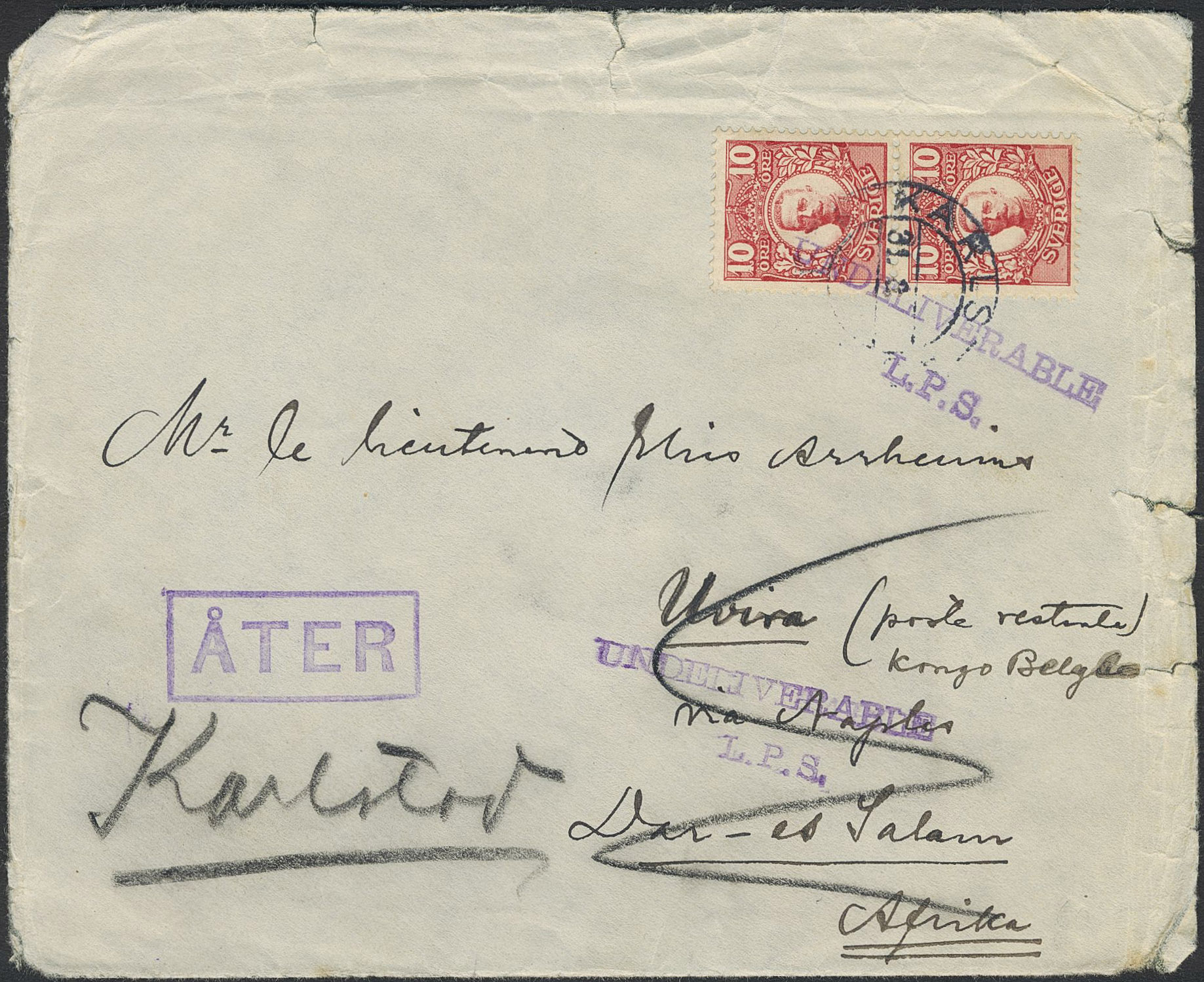 Sweden. Facit 82 on cover, 2×10 öre on cover sent from KARLSTAD 31.8.(14) to German East Africa. Undeliverable with pmks UNDELIVERABLE L.P.S. and ÅTER.