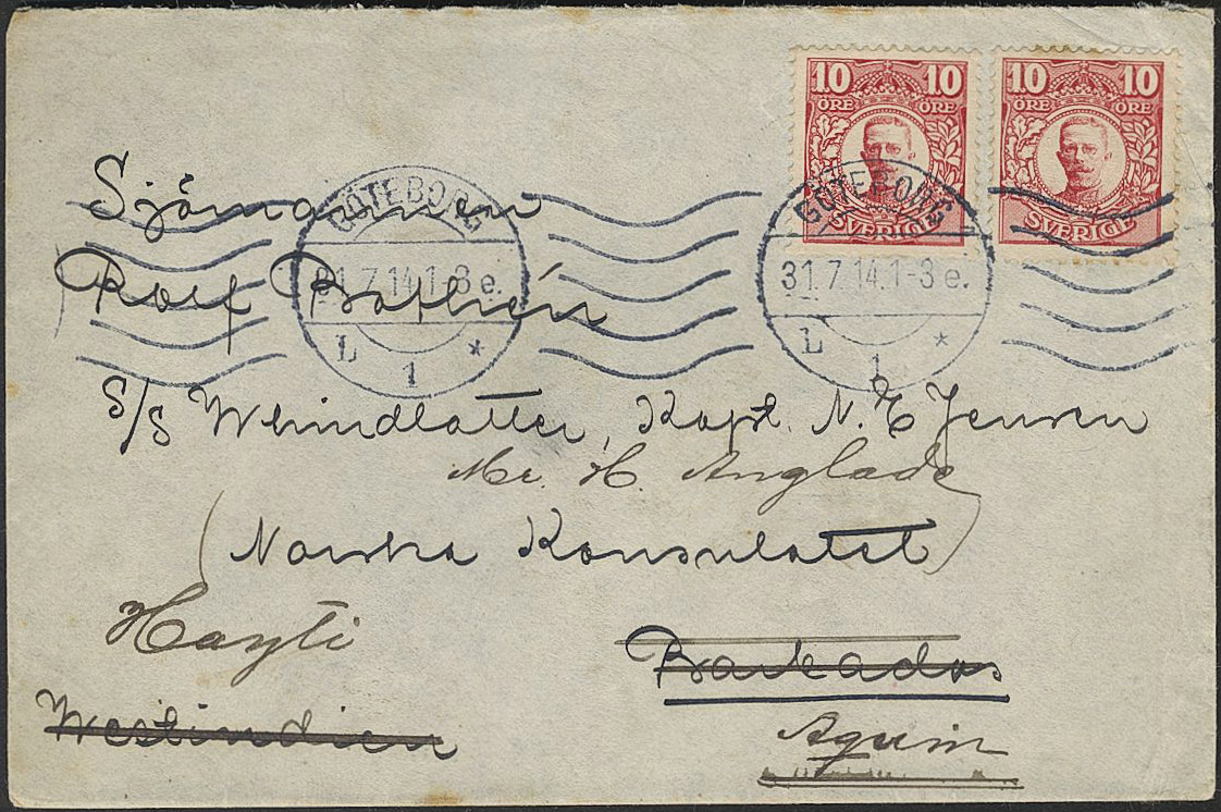 Sweden. Facit 82 on cover, 10 öre red. Two ex. canc. GÖTEBORG 31.7.14 on cover sent to HAITI, arrival canc. 12 SEP 1914. Scarce destination.