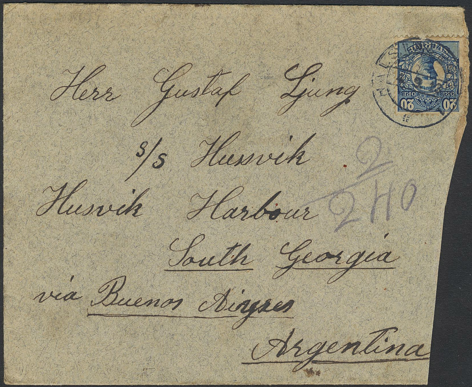 Sweden. Facit 85 on cover, 20 öre on cover sent from HÄLSINGBORG 4.9.13 to South Georgia with arrival pmk HUSV.HA.. Some imperfections but very scarce destination.
