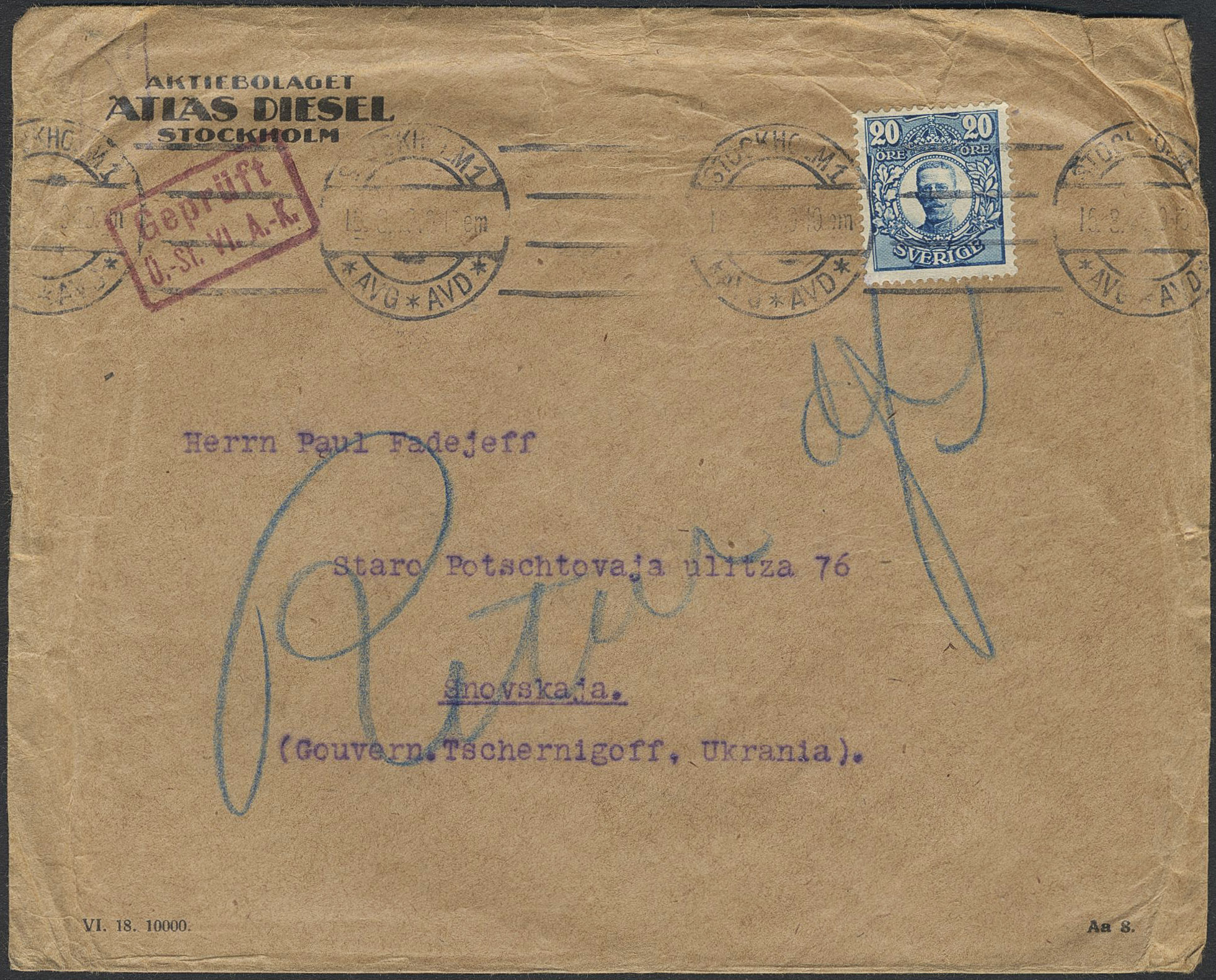 Sweden. Facit 85 on cover, Cover sent from STOCKHOLM 1 18.9.18 to Ukrainian Peoples's Republic, but returned. Very scarce destination.