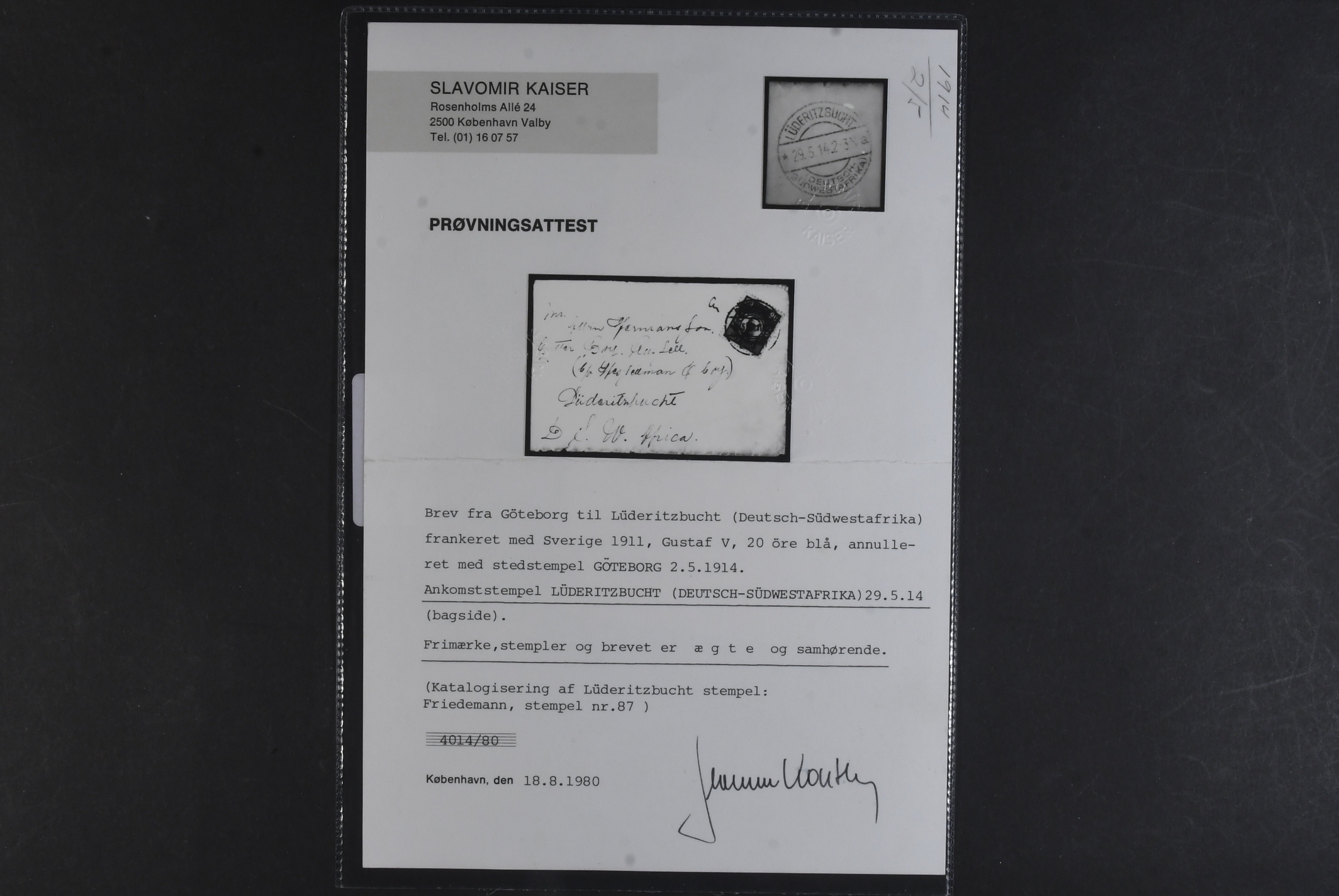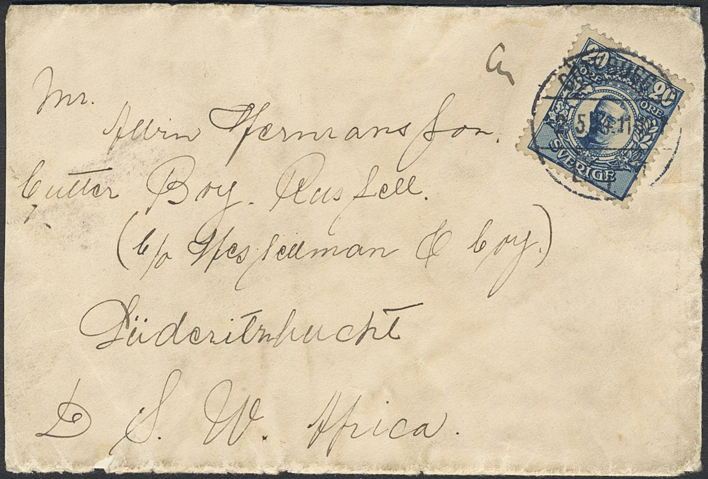 Sweden. Facit 85 on cover, 20 öre on cover sent from GÖTEBORG 2.5.14 to German South Africa with arrival pmk LÜDERITZBUCHT 29.5.14. Certificate Kaiser (1980).