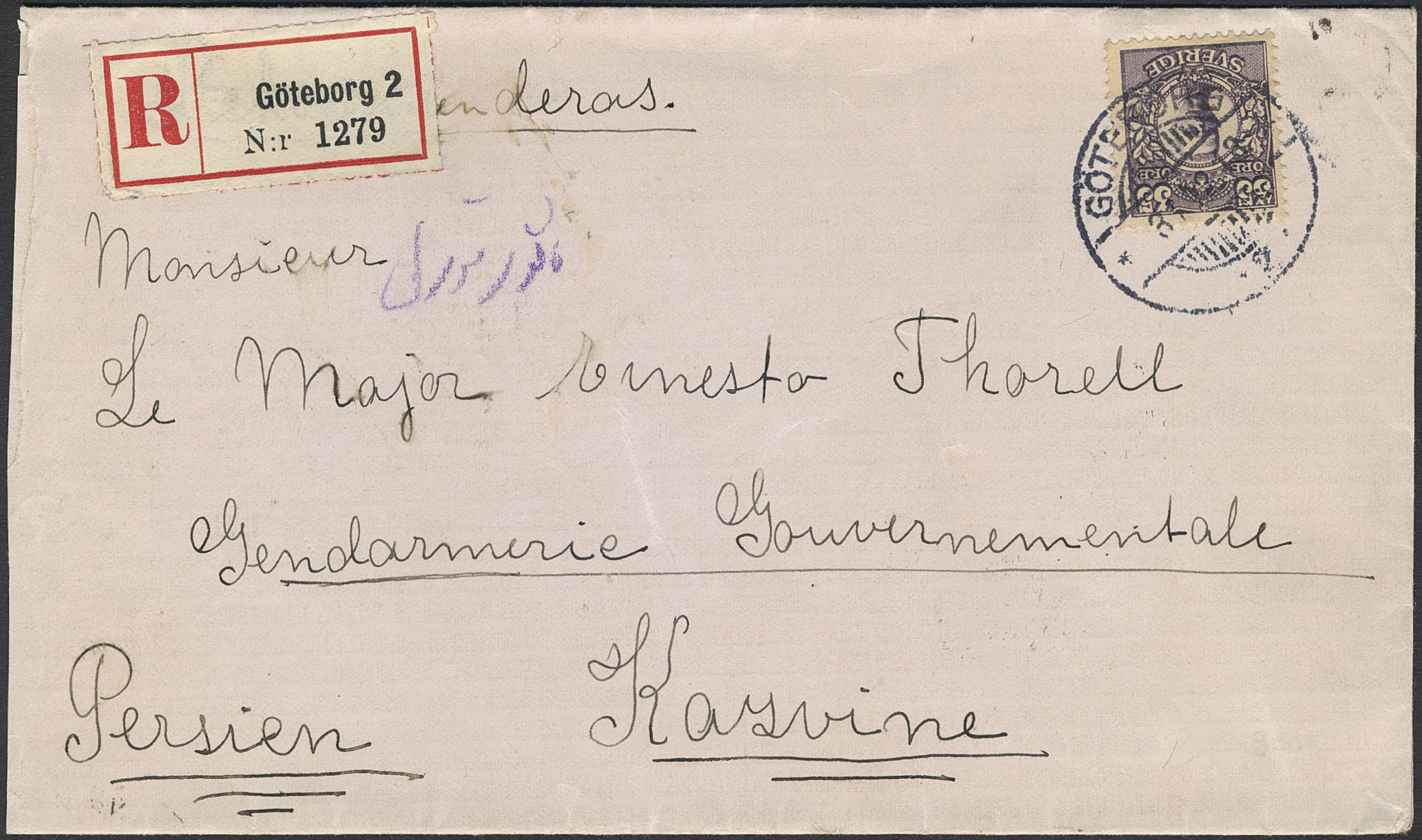 Sweden. Facit 89 on cover, 35 öre on registered cover sent from GÖTEBORG 31.12.18 to Persia with several arrival pmks on the reverse.