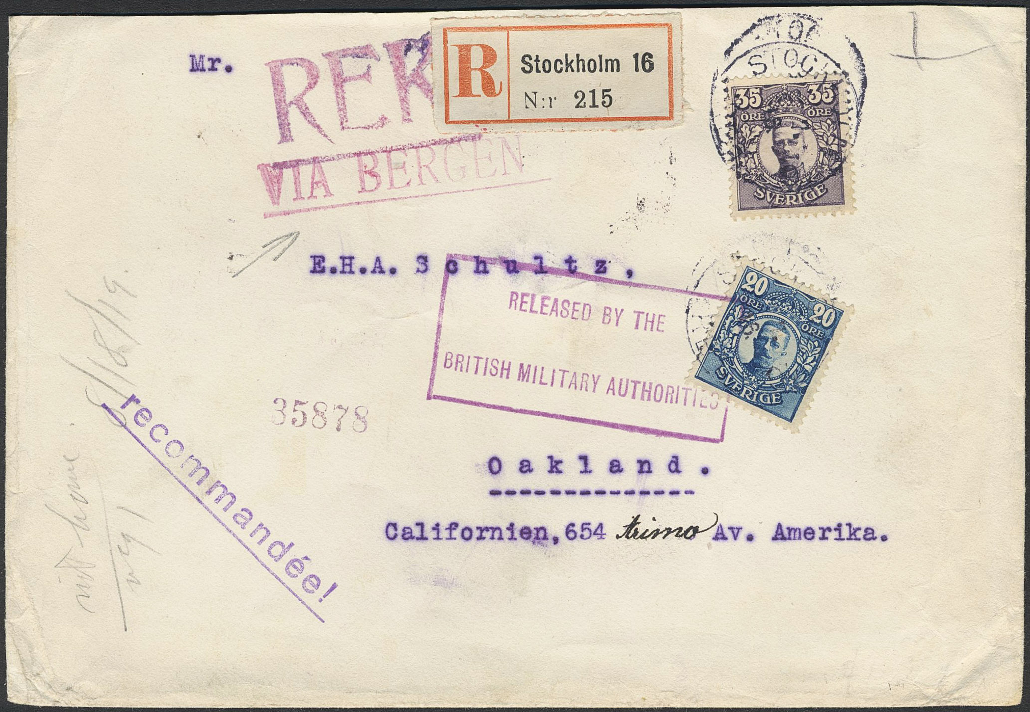 Sweden. Facit 89, 85 on cover, 20+35 öre on registered cover sent from STOCKHOLM 8.7.16 VIA BERGEN to USA with cancel RELEASED BY THE BRITISH MILITARY AUTHORITIES. Arrival pmks on the reverse.