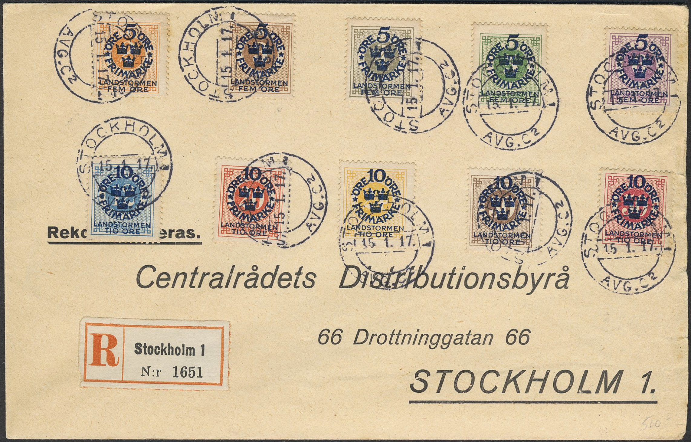 Sweden. Facit 105–14 on cover, 1916 Landstorm I SET (10) on registered cover cancelled STOCKHOLM 1 15.1.17.