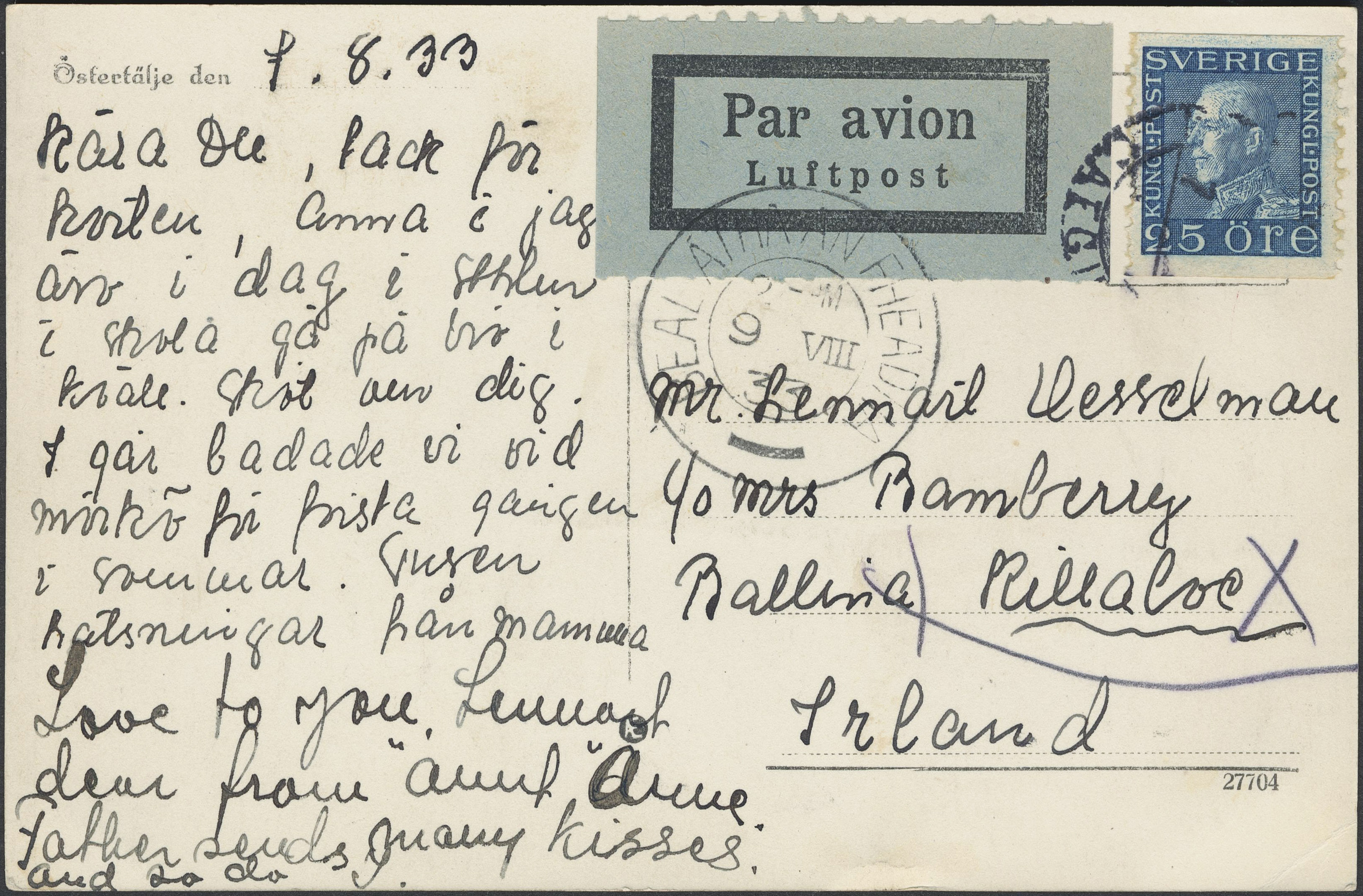 Sweden. Facit 183 on cover, 25 öre on air mail postcard sent from ÖSTERTELJE 7.8.33 to Ireland, Arrival pmk BEAL ÁTHA AN FHEADHA 9.VIII.33. Very scarce destination, only four recorded covers to the Irish Free State according to Ferdén, in which work the pc also is pictured.