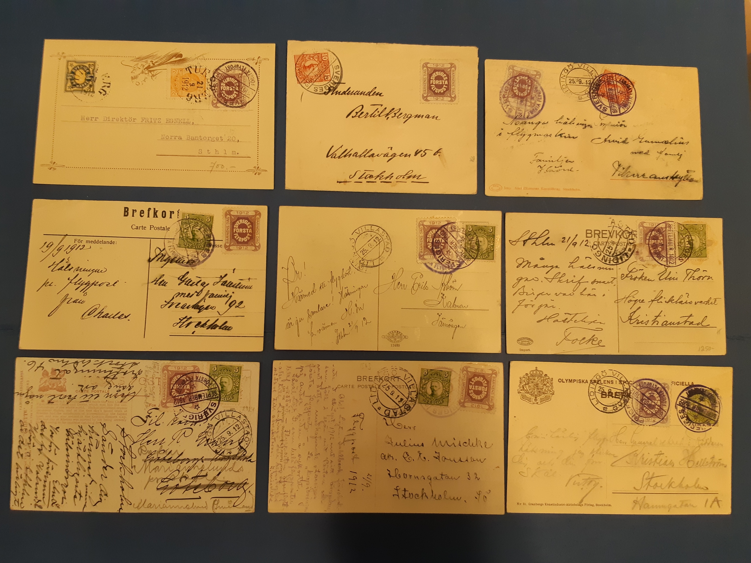 Sweden. Semi-official air mail Facit HF1 on cover, Semi official air mail stamp (60 öre) on one cover and eight postcards sent domestically.The entire lot is presented at www.philea.se. Nice lot. (9).