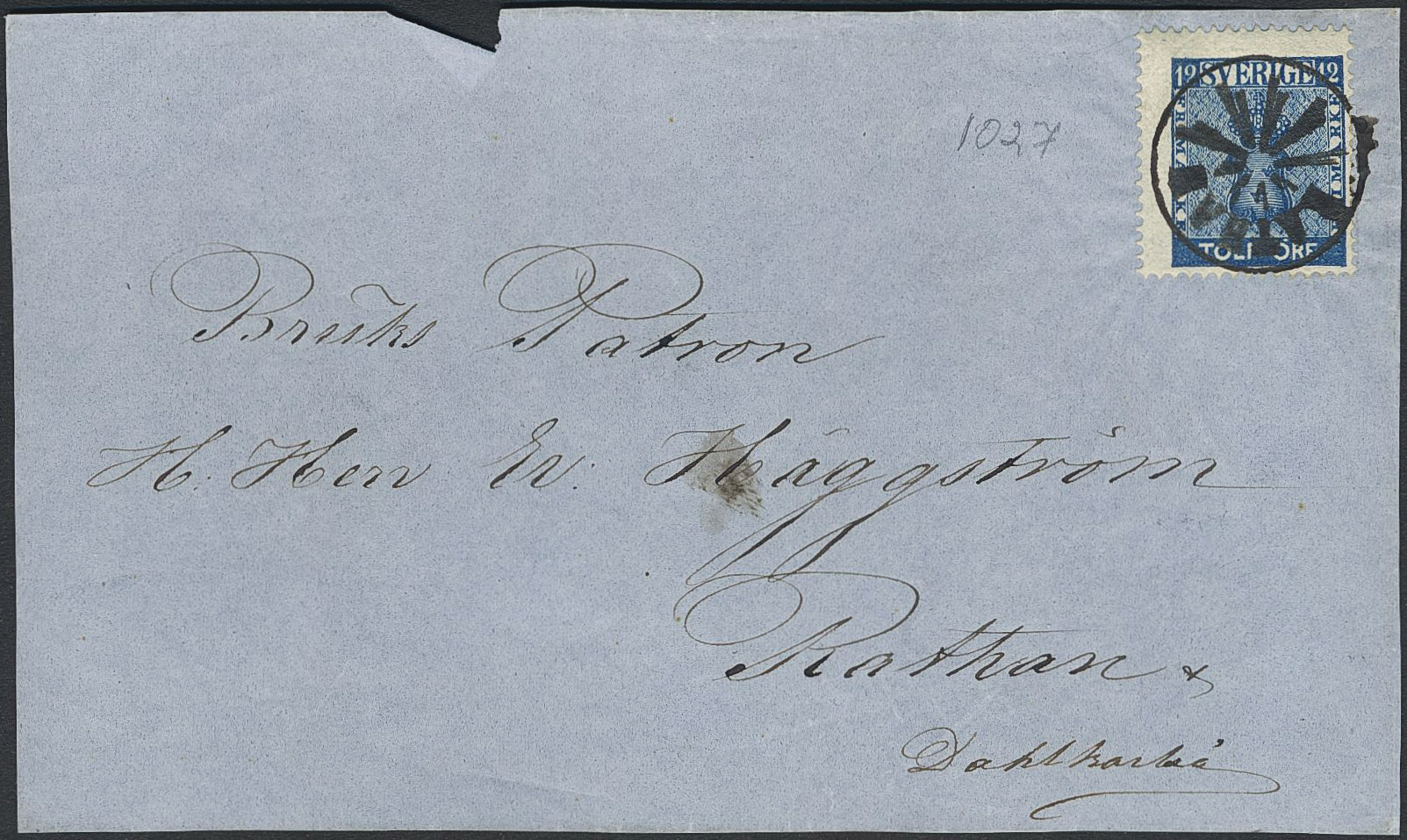 Sweden. Facit 9, AC county. RATHAN, ray postmark. Cover front sent to Dalkarlså.