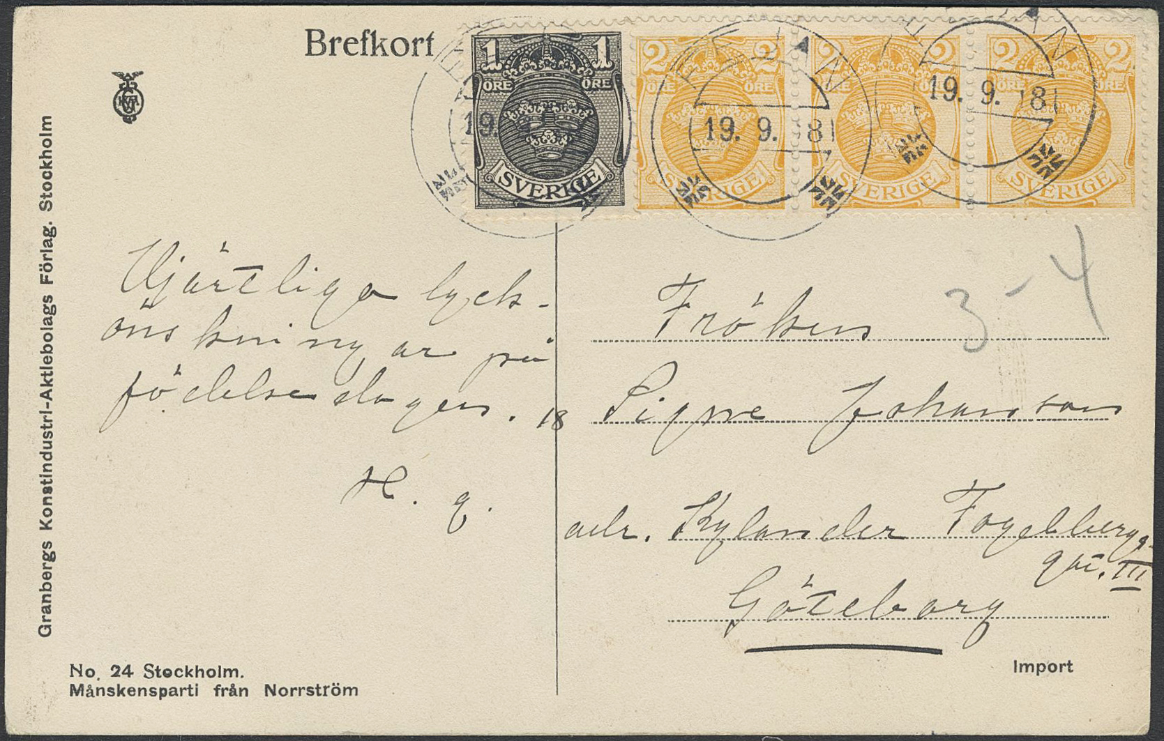 Sweden. Facit 71, 72, B county. FEJAN 19.9.18. Superb postcard sent to Gothenburg. Postal: 3500+:-