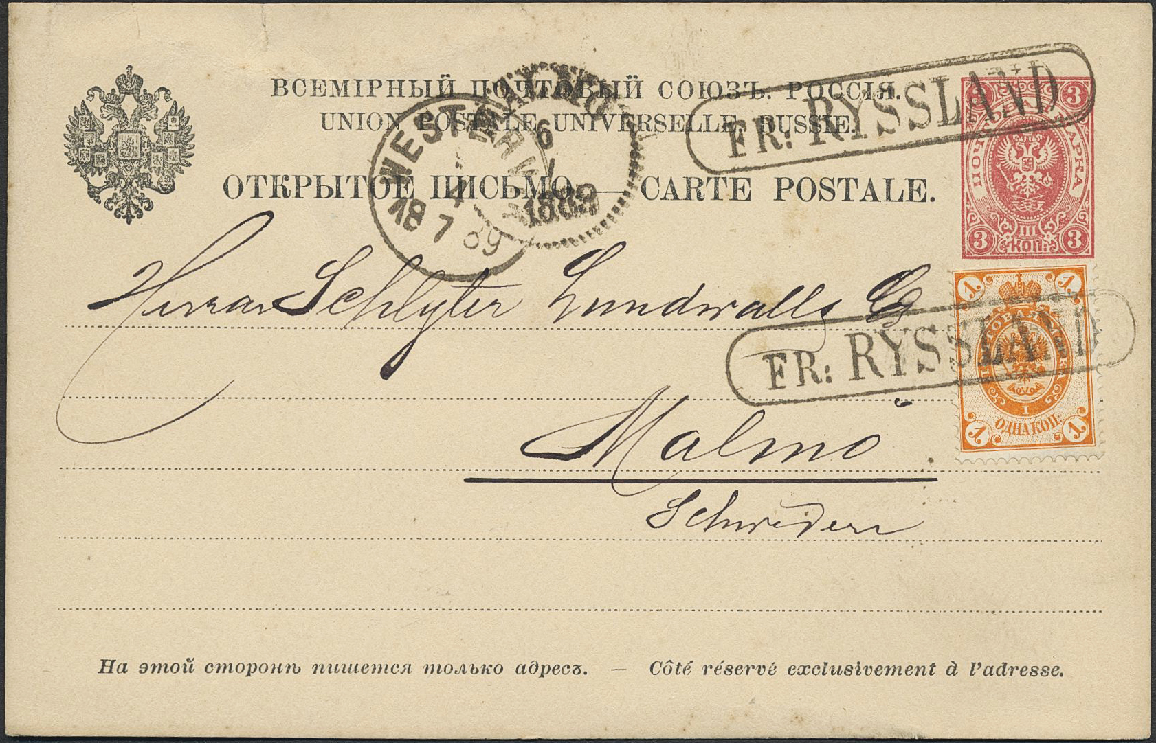 Sweden. Cancellations, FR: RYSSLAND. Postcard dated 'Libau 21/3 Juli 1889' sent via WESTERVIK 4.7.1889 to MALMÖ 6.7.1889. Superb. Postal: 5000:-