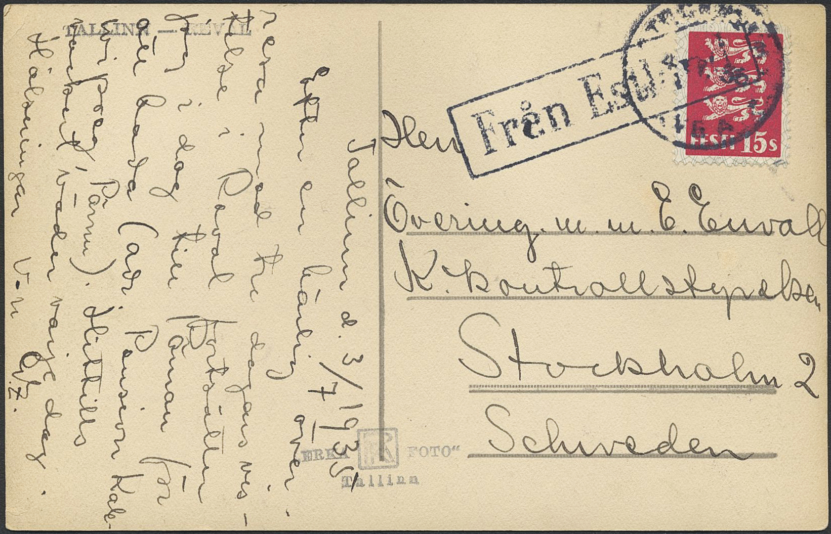 Sweden. Cancellations, FRÅN ESTLAND. Postcard dated 'Tallinn d. 3/7 1935' sent to STOCKHOLM 4.7.35. Postal: 2000:-
