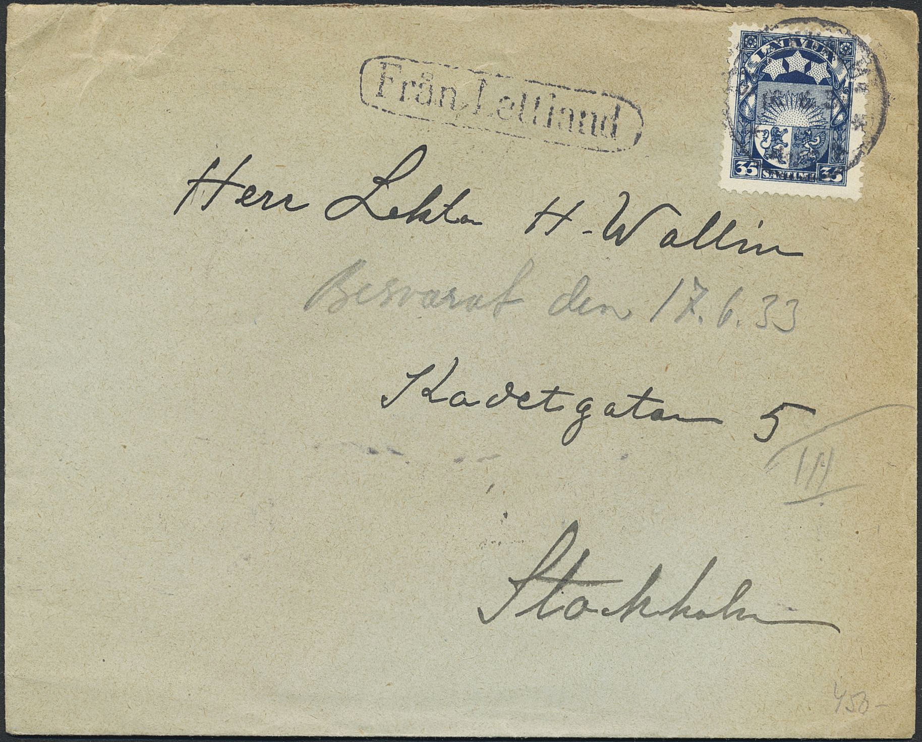 Sweden. Cancellations, FRÅN LETTLAND. Incoming cover sent from Latvia to STOCKHOLM 16.6.33. Postal: 2000:-