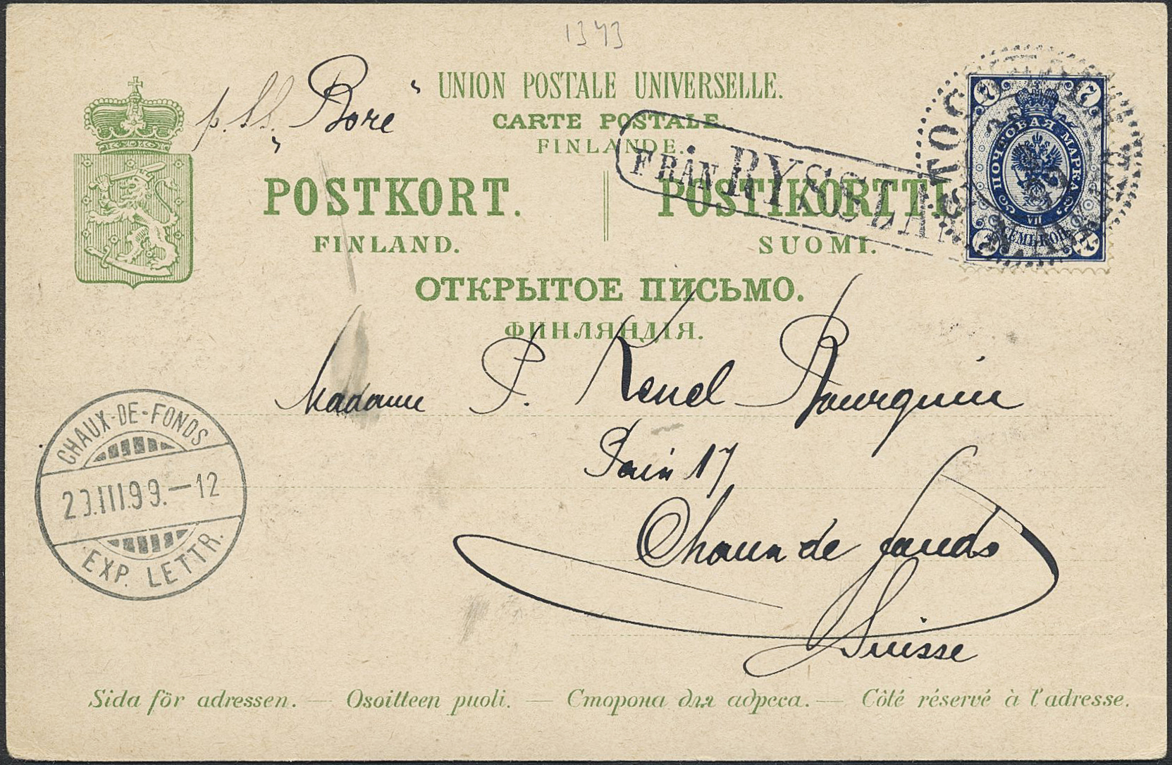 Sweden. Cancellations, FRÅN RYSSLAND. Postcard 'å bord du Bore' sent via STOCKHOLM 25.3.99 to Switzerland. Postal: 1500:-