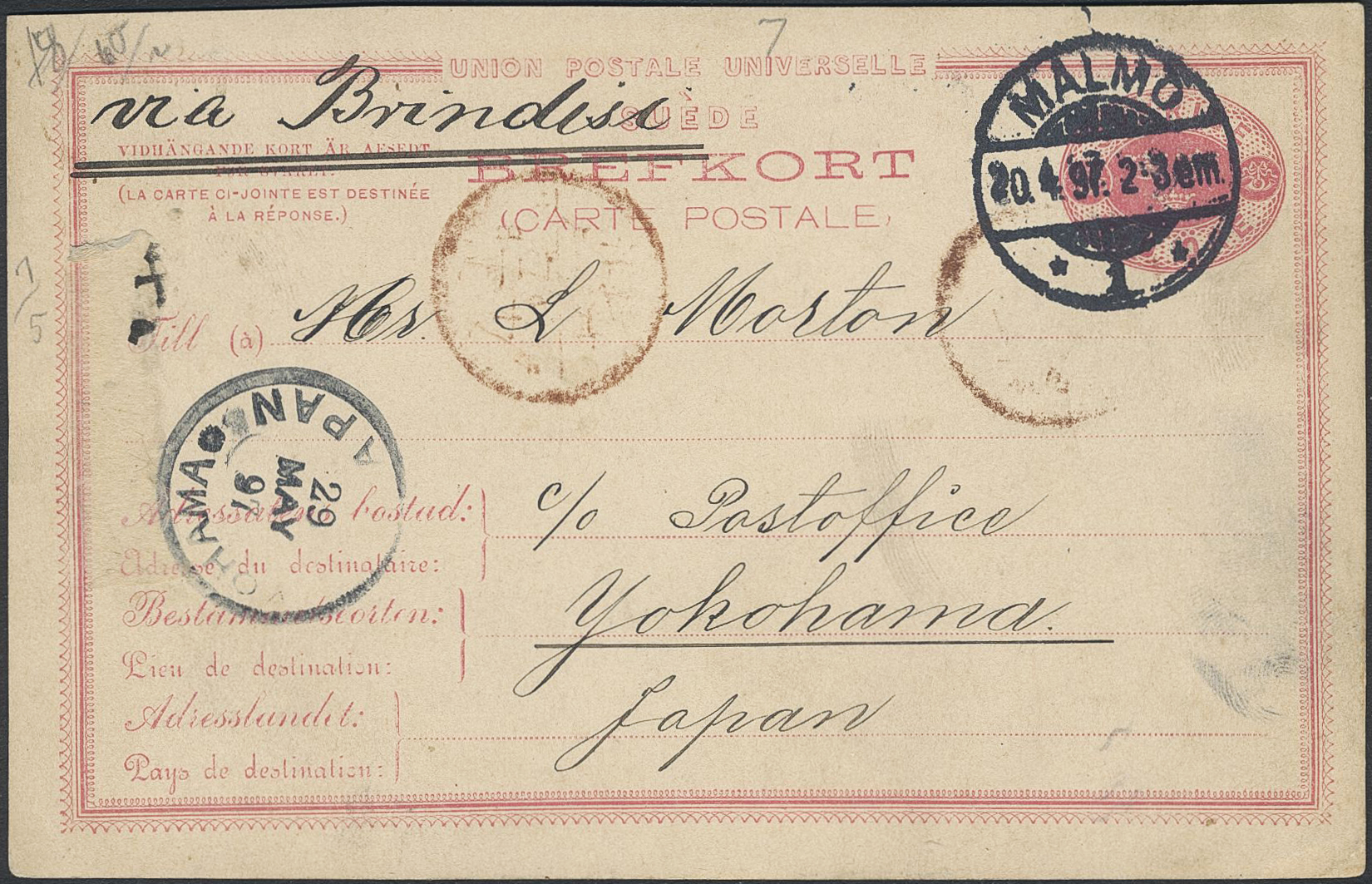 Sweden. Postal stationery, Single postcard, Facit bKe4, Postcard 10 öre sent from MALMÖ 20.4.97 'via Brindisi' to Japan, with arrival pmk YOKOHAMA JAPAN 29.MAY.97.