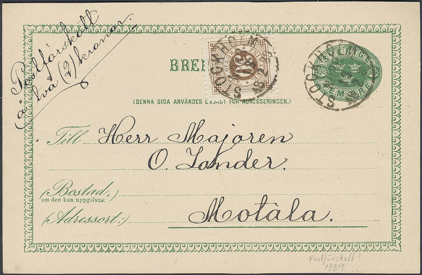 Sweden. Postal stationery, Single postcard, Facit bKe7, 47, Postcard 5 öre additionally franked with 30 öre, sent with cash on delivery from STOCKHOLM NORR 13.2.1888 to Motala. C.O.D. postcards were prepaid as letters before 1/8 1892. Scarce.