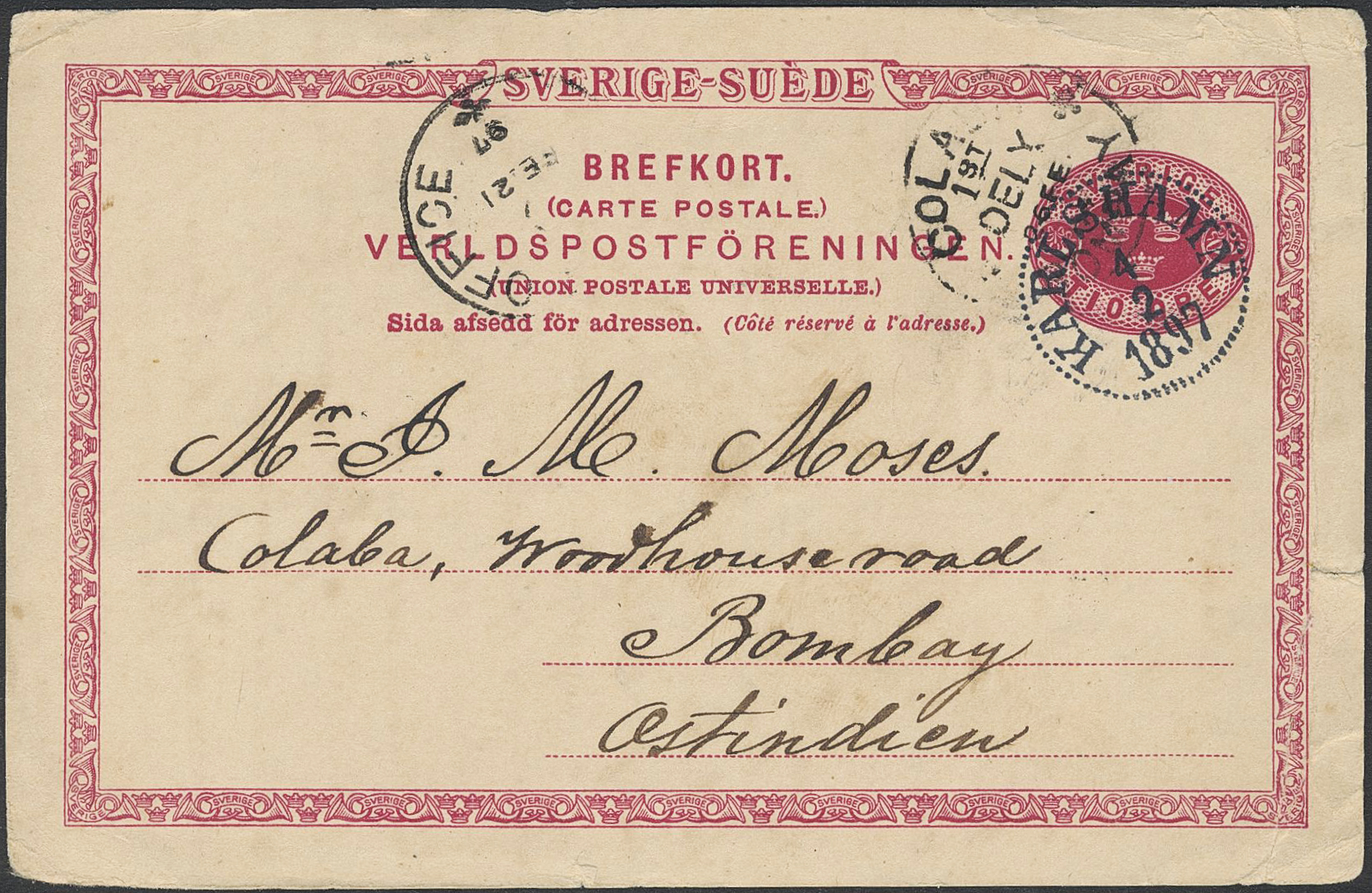 Sweden. Postal stationery, Single postcard, Facit bKe13, Postcard 10 öre sent from KARLSHAMN 4.2.1897 via SEA POST OFFICE 12.FE.97 to India, with arrival pmk COLABA 1ST DELY 26.FE.97. Small creases/tears.
