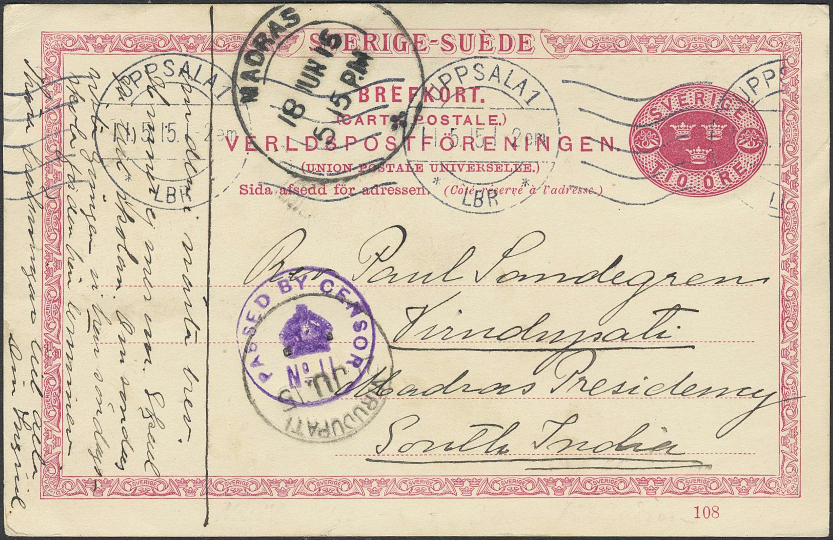 Sweden. Postal stationery, Single postcard, Facit bKe14/108, Postcard 10 öre sent from UPPSALA 1 11.5.15 to South India. Censor mark PASSED BY CENSOR No 11 and arrival pmk MADRAS 18.JUN.15.