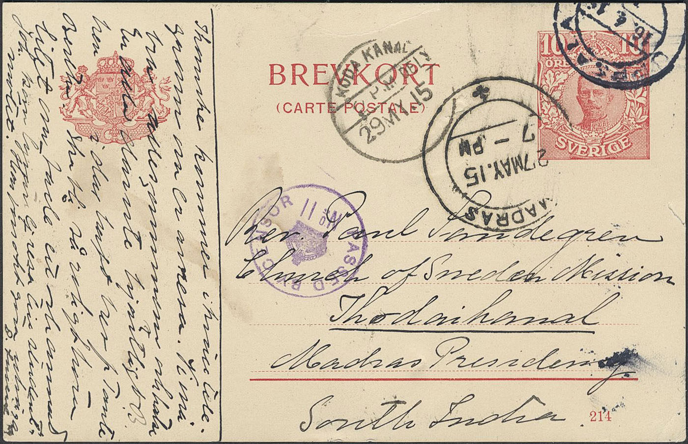 Sweden. Postal stationery, Single postcard, Facit bKe19/214, Postcard 10 öre sent from UPPSALA 16.4.15 to India. With censor mark and arrival marks MADRAS 27.MAY.15 and KODA KANAL29.MY.15.