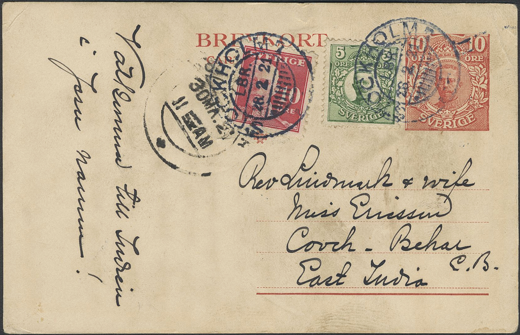 Sweden. Postal stationery, Single postcard, Facit bKe21, Postcard 10 öre additionally franked with 15 öre, sent from STOCKHOLM LBR 28.2.21 to India, with arrival mark.