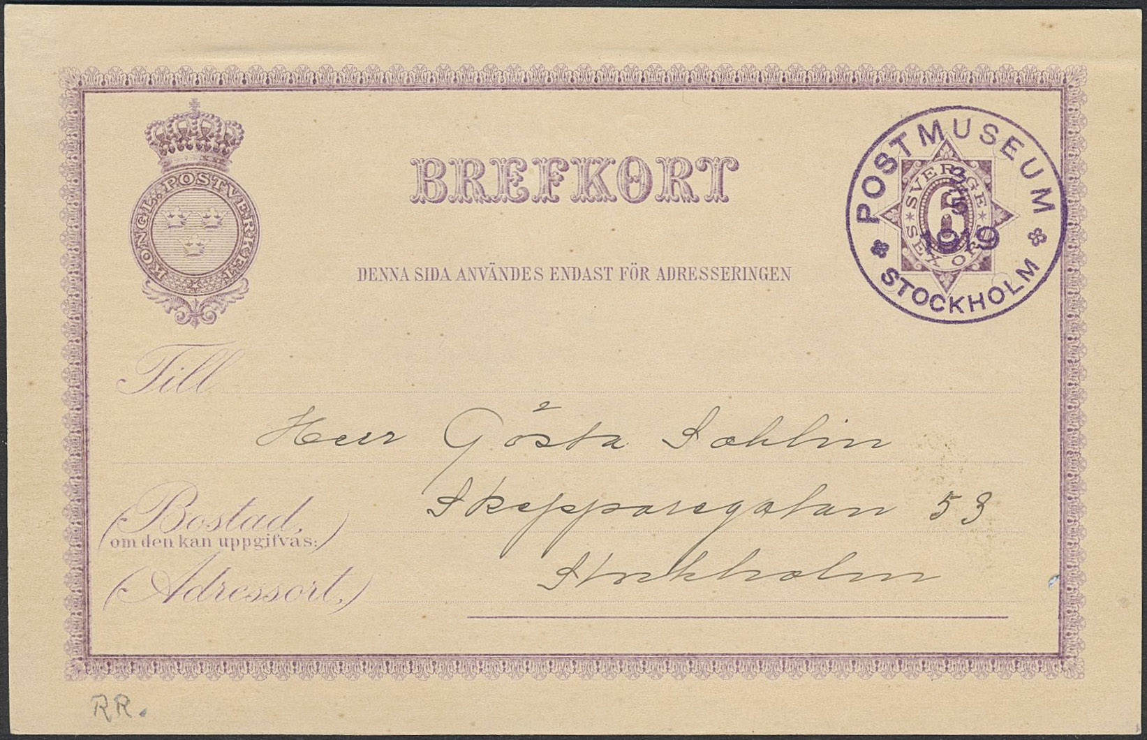 Sweden. Postal stationery, Postmusei vernissagepostkort, Facit PMvpK1, Postcard '6 öre' sent under cover from POSTMUSEUM STOCKHOLM 3.5.1919 to Gösta Sahlin, Stockholm. Circulation, only 123 copies. SEK 4000