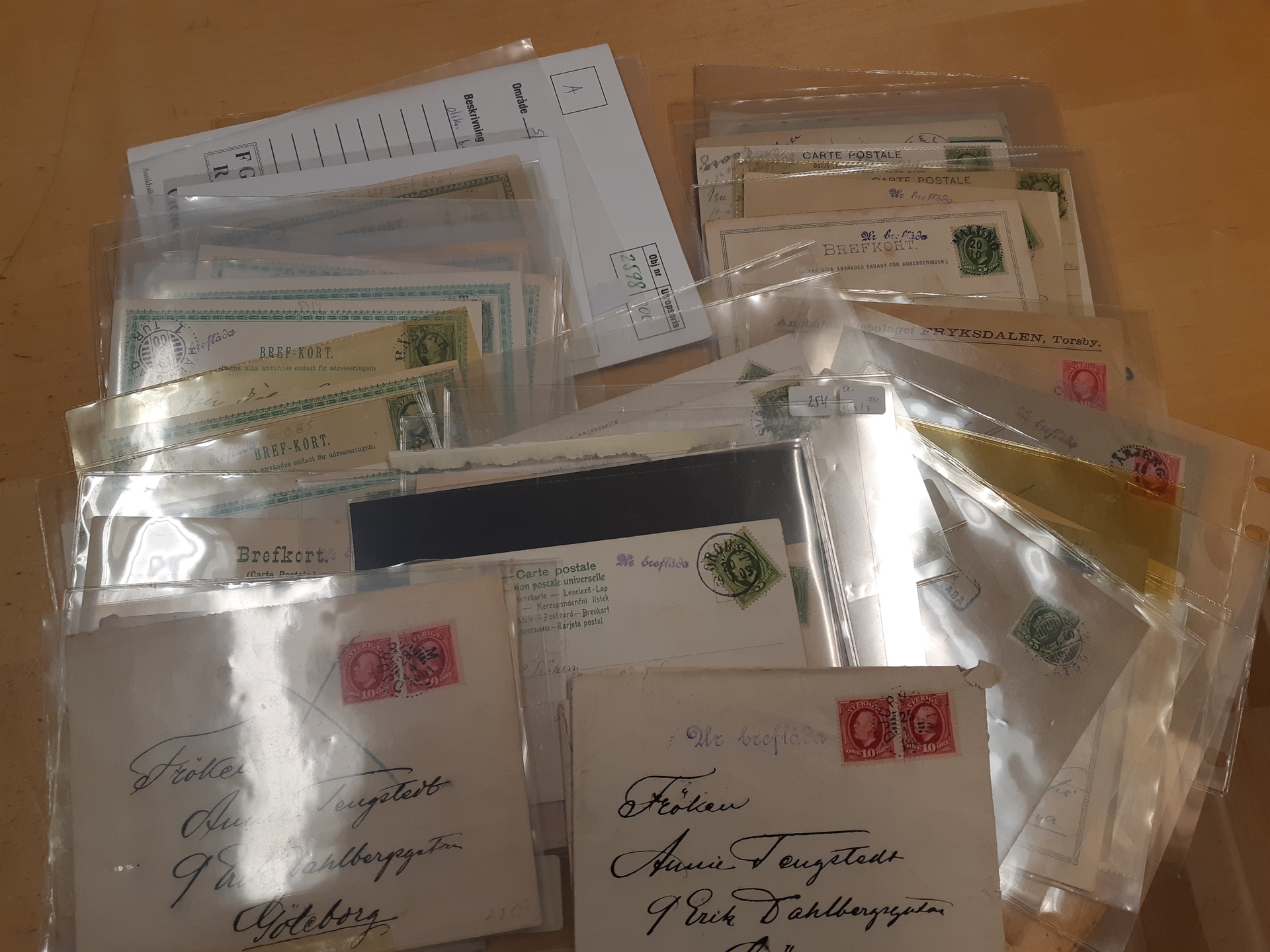 Sweden. Cancellations, collection/accumulation UR BREF-/BREVLÅDA in small box. Pmks on covers and cards, mostly during Oscar II period, plus a few foreign. In between heavily duplicated. Opportunity for a new collecting area. (58)