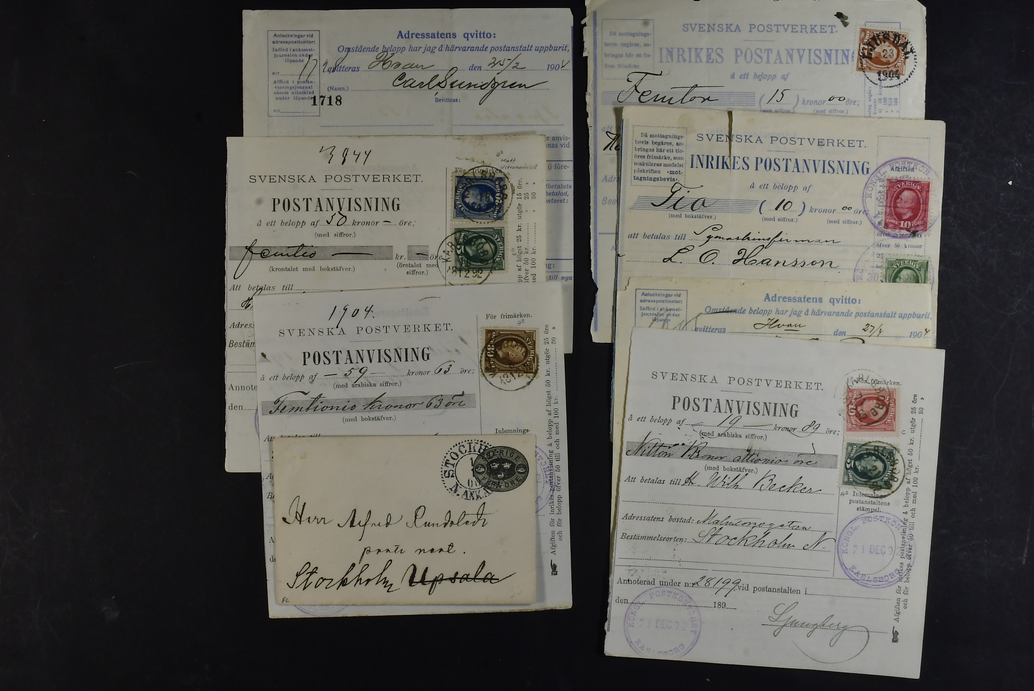 Sweden. Cancellations, lot COLOURED EXPEDITION cancellations. Mostly on money orders, plus a few receipts, one address card, etc. (29)