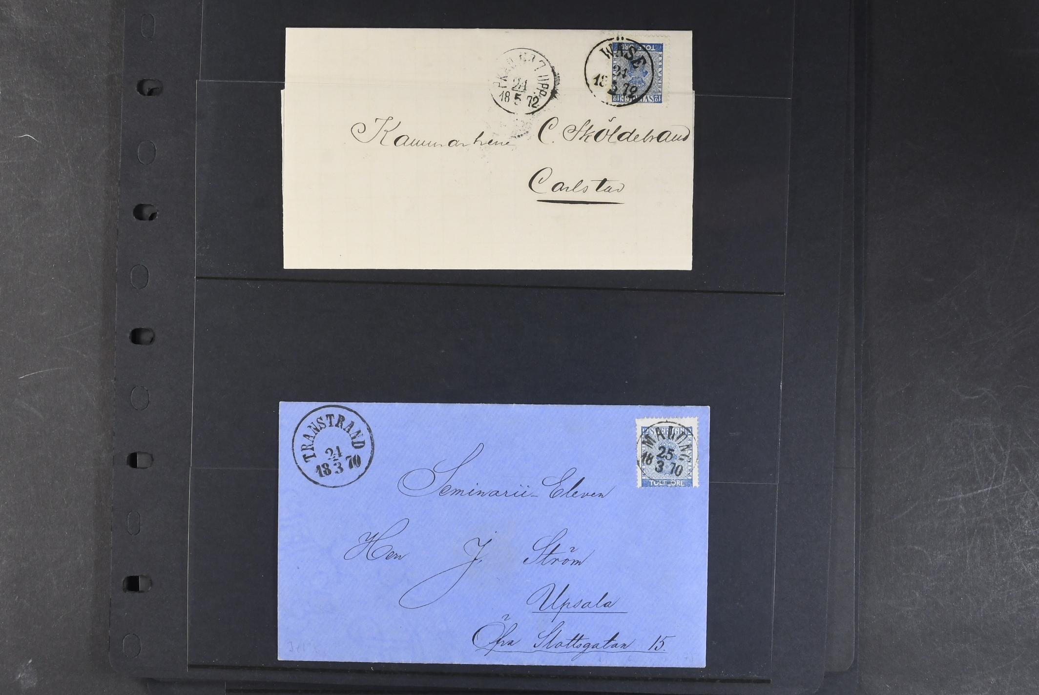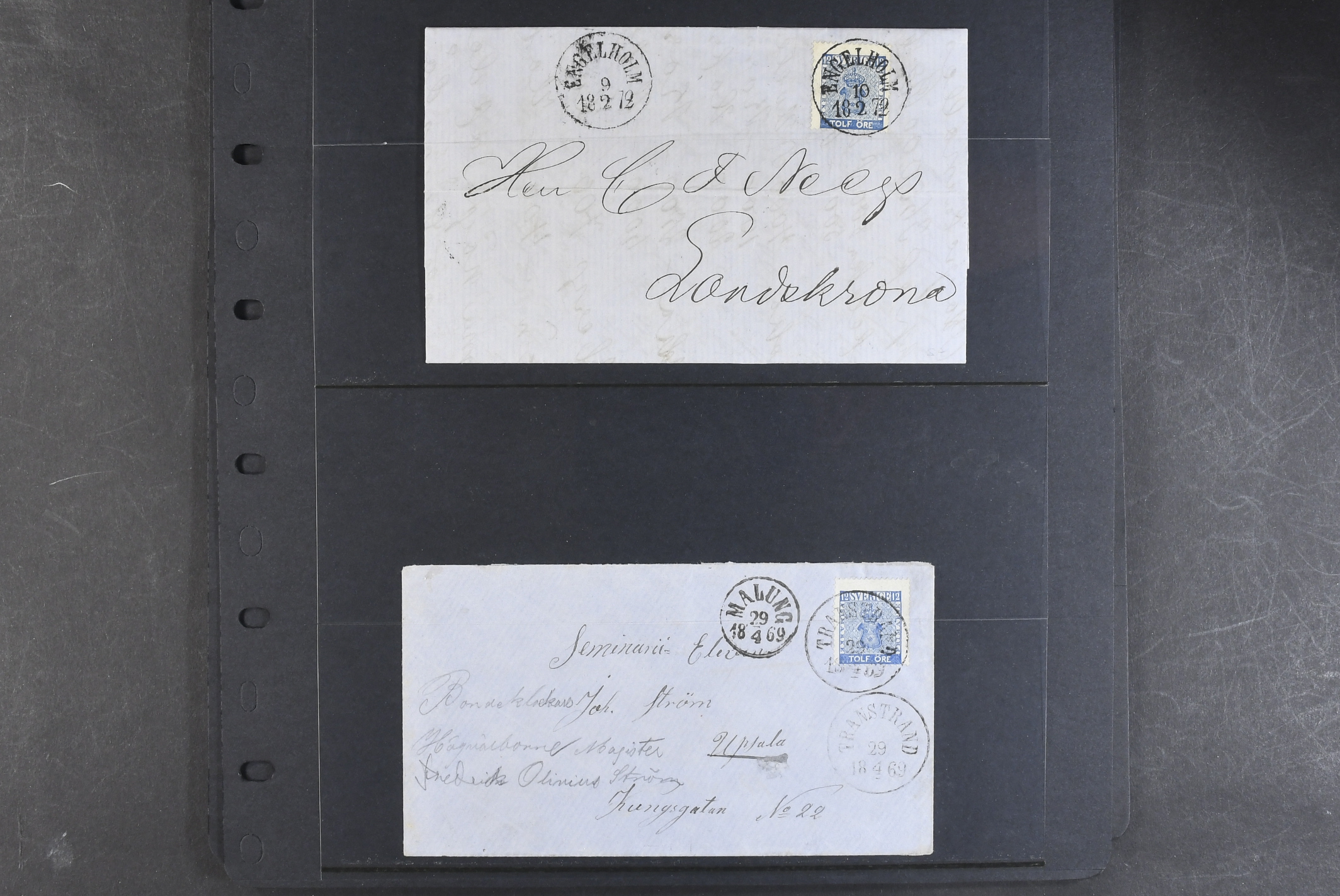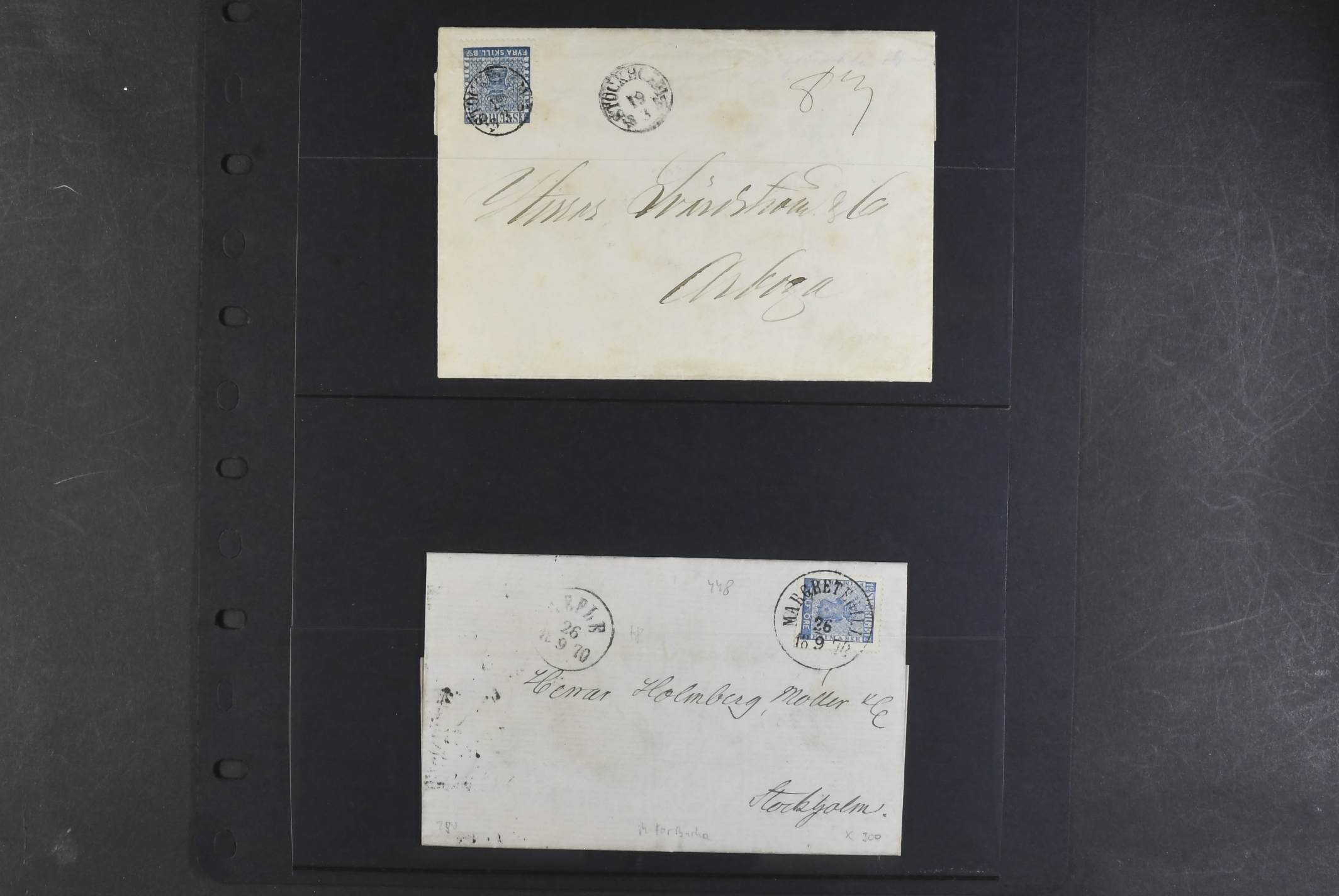 Sweden. Lot covers 1857–1872 on visir leaves. One 4 skill bco, eleven Coat-of-Arms incl. one registered and one Lying Lion, incl. some better cancellations. The entire lot is presented at www.philea.se. Mostly good quality. (13)