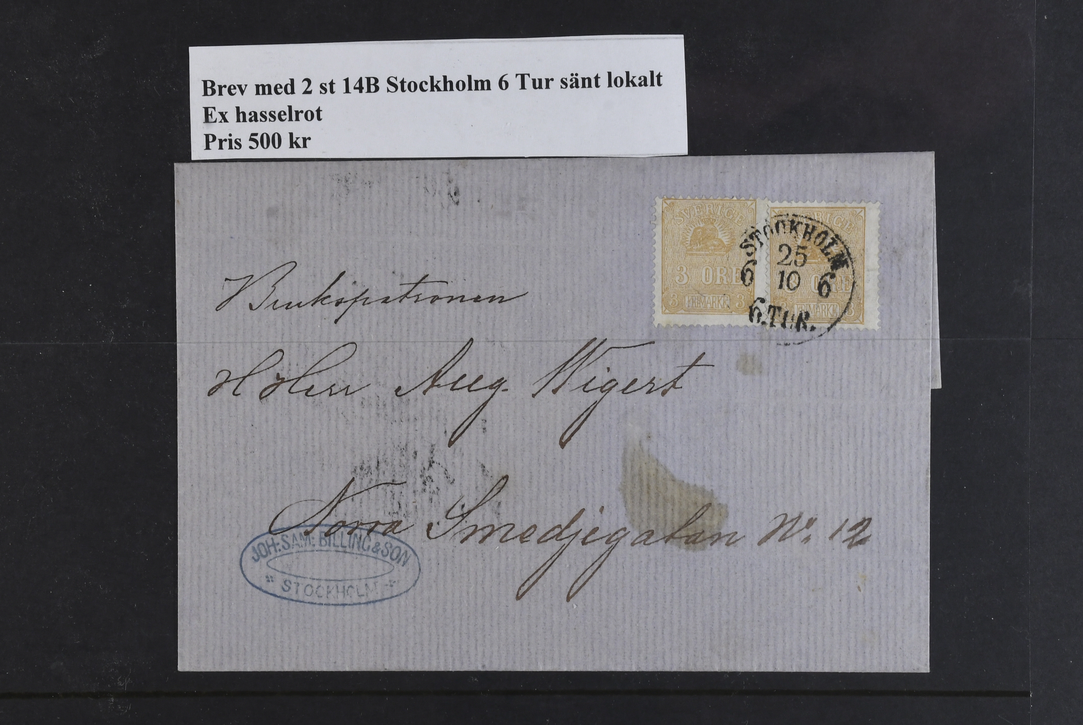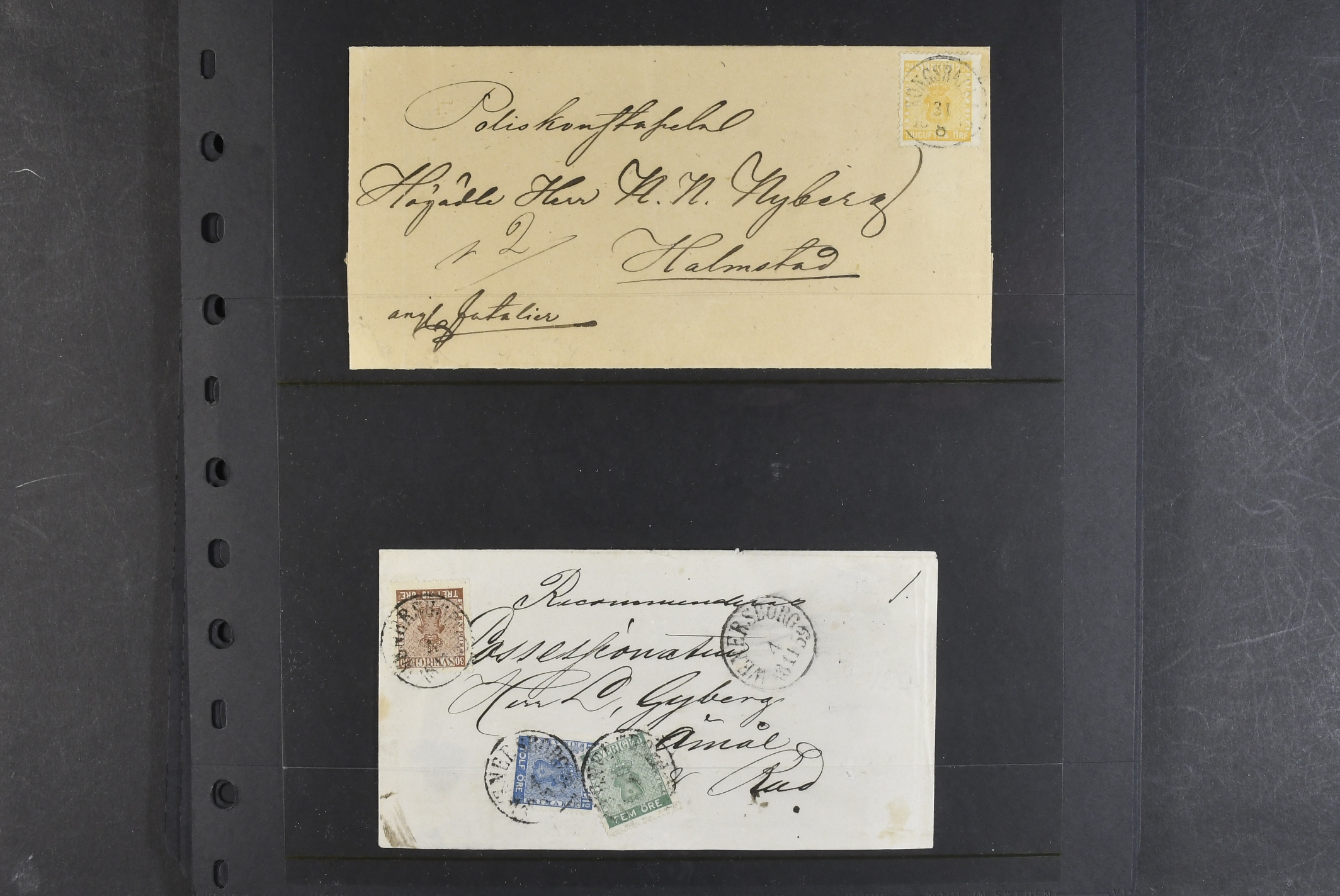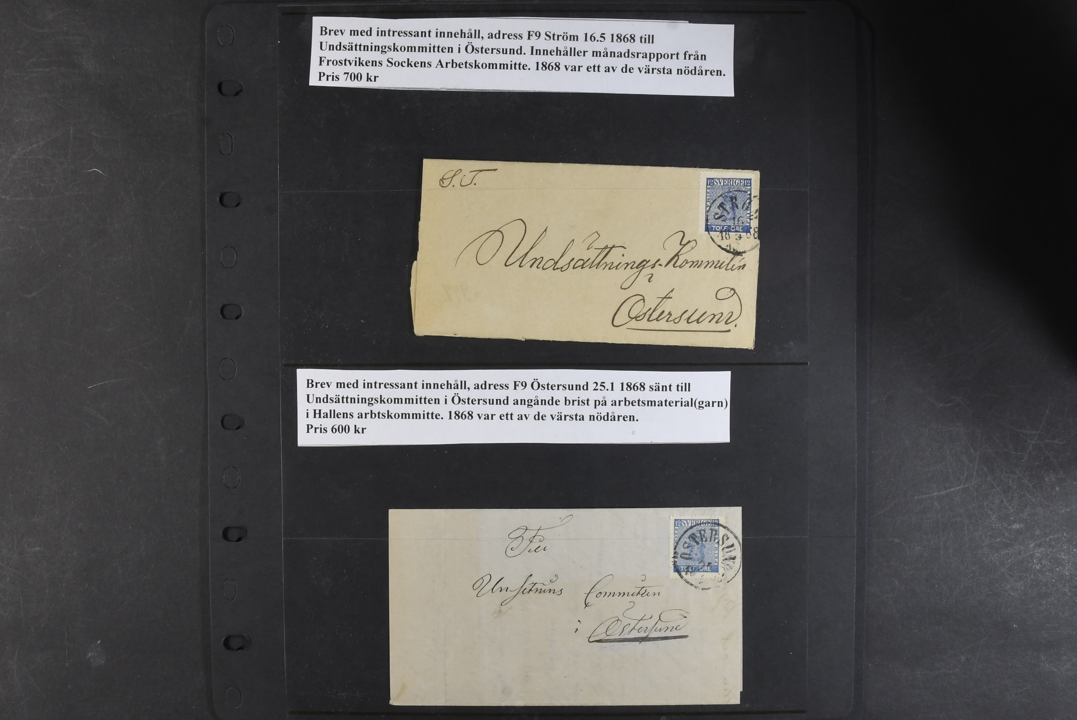 Sweden. Lot covers 1857–1872 on visir leaves. One 4 skill bco, eleven Coat-of-Arms incl. one registered and one Lying Lion, incl. some better cancellations. The entire lot is presented at www.philea.se. Mostly good quality. (13)